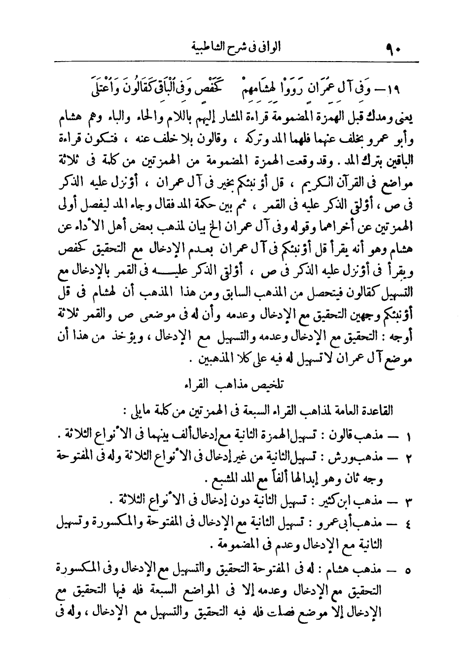 كقالون فيتحصل من المذهب السابق، ومن هذا المذهب أن لهشام في قُلْ أَأُنَبِّئُكُمْ وجهين: التحقيق مع الإدخال وعدمه، وأن له في موضعي ص والْقَمَرُ ثلاثة أوجه: التحقيق مع الإدخال، وعدمه والتسهيل مع الإدخال، ويؤخذ من هذا أن موضع آل عمران لا تسهيل له فيه على كلا المذهبين.