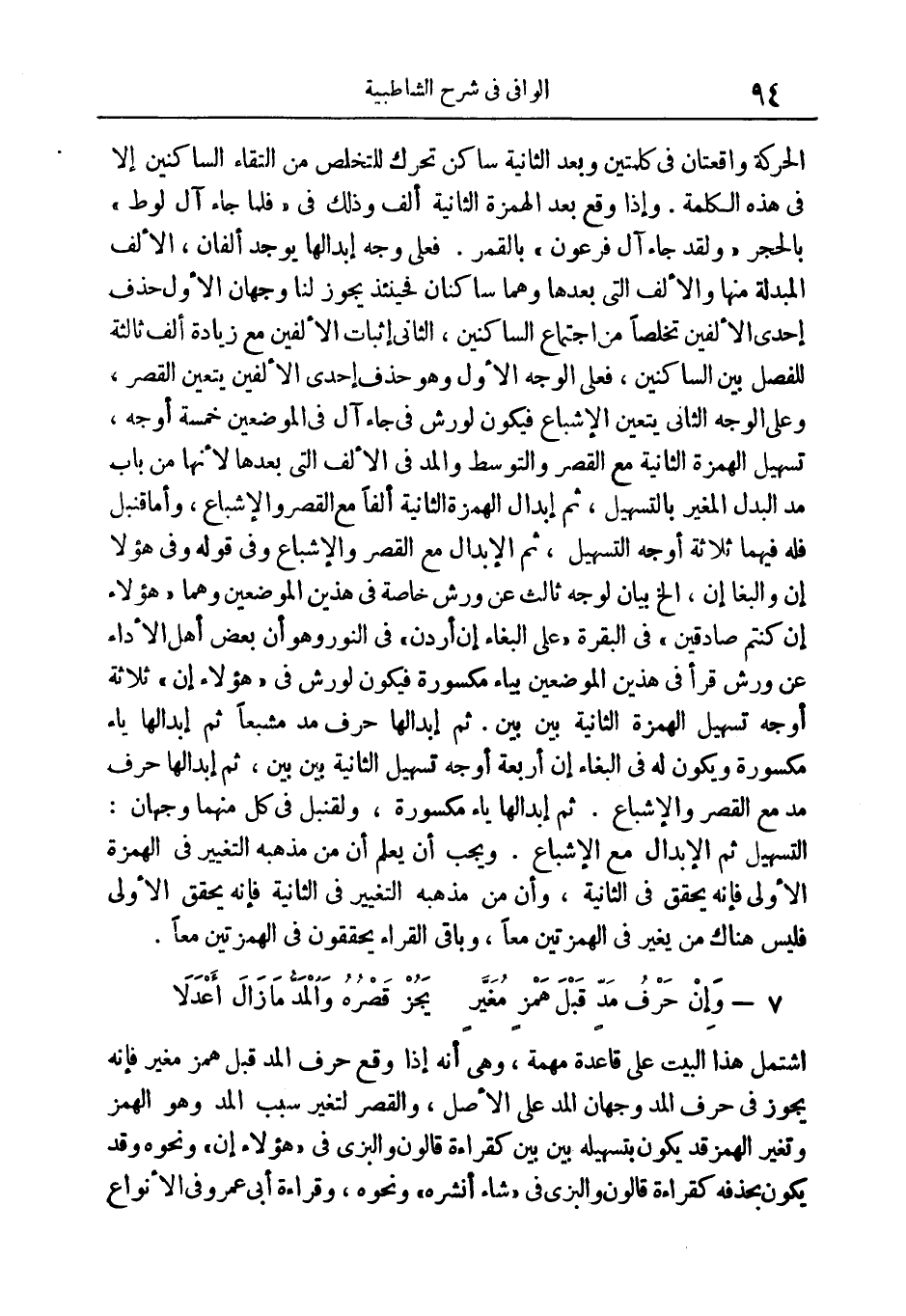 المعنى: اشتمل هذا البيت على قاعدة مهمة، وهي أنه إذا وقع حرف المد قبل همز مغير؛ فإنه يجوز في حرف المد وجهان على الأصل، والقصر لتغير سبب المد وهو الهمز وتغير الهمز قد يكون بتسهيله بين بين كقراءة قالون والبزي في هؤُلاءِ إِنْ ونحوه، وقد يكون بحذفه كقراءة قالون والبزي في شاءَ أَنْشَرَهُ ونحوه، وقراءة أبي عمرو في الأنواع