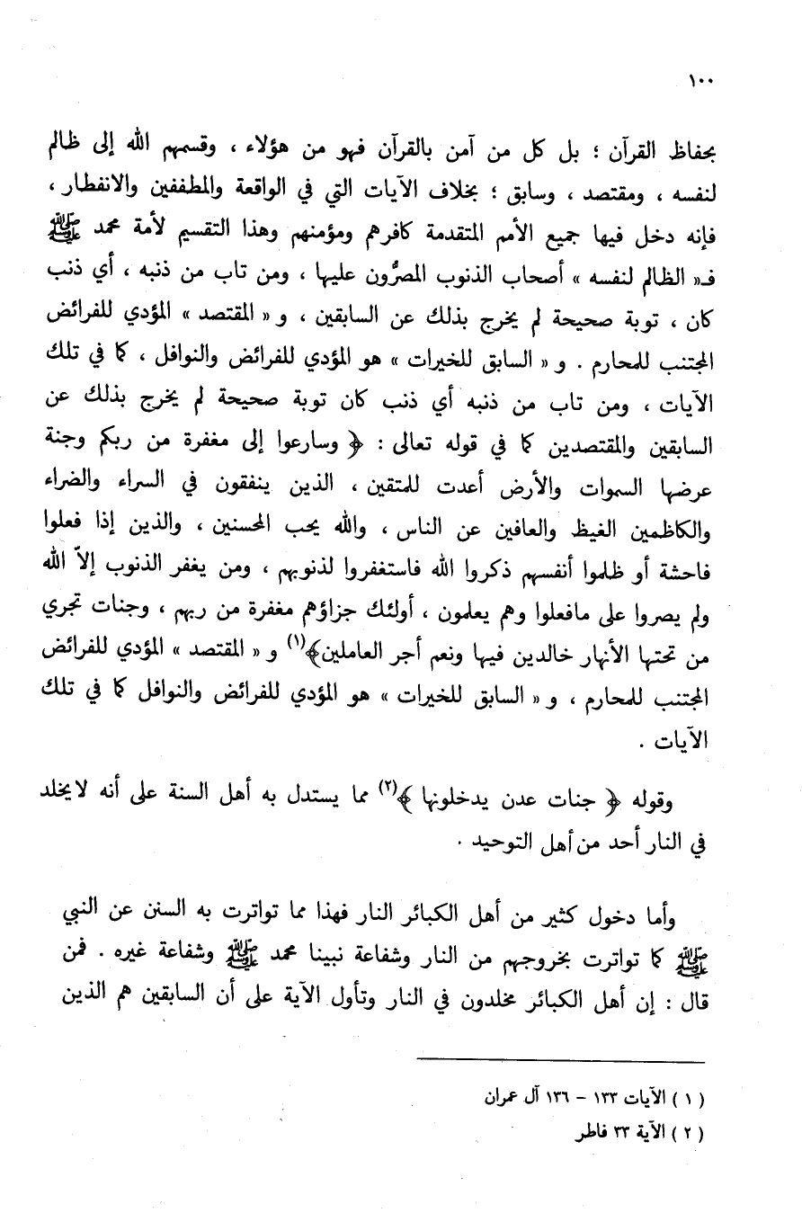 بحفاظ القرآن, بل كل من آمن بالقرآن فهو من هؤلاء, وقسمهم الله إلى ظالم لنفسه, ومقتصد, وسابق, بخلاف الآيات التي في الواقعة والمطففين والانفطار, فإنه دخل فيها جميع الأمم المتقدمة كافرهم ومؤمنهم وهذا التقسيم لأمة محمد صلى الله عليه وسلم ف"الظالم لنفسه" أصحاب الذنوب المصرون عليها, ومن تاب من ذنبه, أي ذنب كان, توبة صحيحة لم يخرج بذلك عن السابقين, و"المقتصد" المؤدي للفرائض المجتنب للمحارم, و"السابق للخيرات" هو المؤدي للفرائض والنوافل, كما في تلك الآيات, ومن تاب من ذنبه أي ذنب كان توبة صحيحة لم يخرج بذلك عن السابقين والمقتصدين كما في قوله تعالى: {وَسَارِعُوا إِلَى مَغْفِرَةٍ مِنْ رَبِّكُمْ وَجَنَّةٍ عَرْضُهَا السَّمَاوَاتُ وَالْأَرْضُ أُعِدَّتْ لِلْمُتَّقِينَ, الَّذِينَ يُنْفِقُونَ فِي السَّرَّاءِ وَالضَّرَّاءِ وَالْكَاظِمِينَ الْغَيْظَ وَالْعَافِينَ عَنِ النَّاسِ وَاللَّهُ يُحِبُّ الْمُحْسِنِينَ, وَالَّذِينَ إِذَا فَعَلُوا فَاحِشَةً أَوْ ظَلَمُوا أَنْفُسَهُمْ ذَكَرُوا اللَّهَ فَاسْتَغْفَرُوا لِذُنُوبِهِمْ وَمَنْ يَغْفِرُ الذُّنُوبَ إِلَّا اللَّهُ وَلَمْ يُصِرُّوا عَلَى مَا فَعَلُوا وَهُمْ يَعْلَمُونَ, أُولَئِكَ جَزَاؤُهُمْ مَغْفِرَةٌ مِنْ رَبِّهِمْ وَجَنَّاتٌ تَجْرِي مِنْ تَحْتِهَا الْأَنْهَارُ خَالِدِينَ فِيهَا وَنِعْمَ أَجْرُ الْعَامِلِينَ} 1 و"المقتصد" المؤدي للفرائض المجتنب للمحارم, و"السابق للخيرات" هو المؤدي للفرائض والنوافل كما في تلك الآيات.