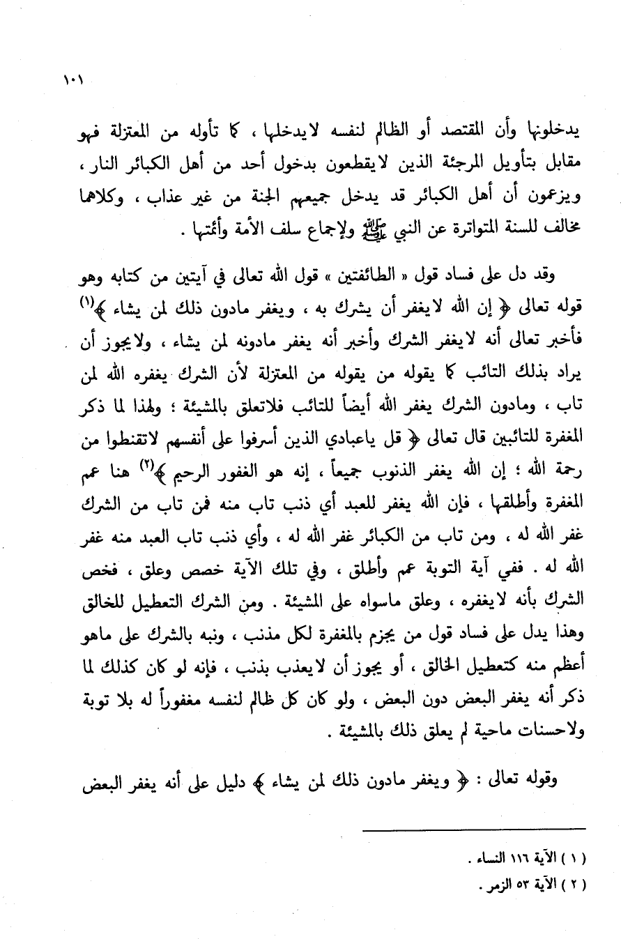 وقد دل على فساد قول "الطائفتين" قول الله تعالى في آيتين من كتابه وهو قوله تعالى: {إِنَّ اللَّهَ لا يَغْفِرُ أَنْ يُشْرَكَ بِهِ وَيَغْفِرُ مَا دُونَ ذَلِكَ لِمَنْ يَشَاءُ} 1 فأخبر تعالى أنه لا يغفر الشرك وأخبر أنه يغفر ما دونه لمن يشاء, ولا يجوز أن يراد بذلك التائب كما يقوله من يقوله من المعتزلة لأن الشرك يغفره الله لمن تاب, وما دون الشرك يغفر الله أيضا للتائب فلا تعلق بالمشيئة, ولهذا لما ذكر المغفرة للتائبين قال تعالى {قُلْ يَا عِبَادِيَ الَّذِينَ أَسْرَفُوا عَلَى أَنْفُسِهِمْ لا تَقْنَطُوا مِنْ رَحْمَةِ اللَّهِ إِنَّ اللَّهَ يَغْفِرُ الذُّنُوبَ جَمِيعاً إِنَّهُ هُوَ الْغَفُورُ الرَّحِيمُ} 2 هنا عمم المغفرة وأطلقها, فإن الله يغفر للعبد أي ذنب تاب منه فمن تاب من الشرك غفر الله له ومن تاب من الكبائر غفر الله له وأي ذنب تاب العبد منه غفر الله له. ففي آية التوبة عمم وأطلق, وفي تلك الآية خصص وعلق, فخص الشرك بأنه لا يغفره, وعلق ما سواه على المشيئة. ومن الشرك التعطيل للخالق وهذا يدل على فساد قول من يجزم بالمغفرة لكل مذنب, ونبه بالشرك على ما هو أعظم منه كتعطيل الخالق, أو يجوز أن لا يعذب بذنب, فإنه لو كان كذلك لما ذكر أنه يغفر البعض دون البعض, ولو كان كل ظالم لنفسه مغفورا له بلا توبة ولا حسنات ماحية لم يعلق ذلك بالمشيئة.