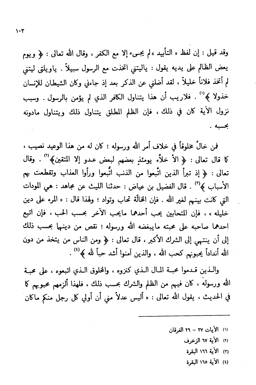 فمن خال مخلوقا في خلاف أمر الله ورسوله, كان له من هذا الوعيد نصيب, كما قال تعالى: {الْأَخِلَّاءُ يَوْمَئِذٍ بَعْضُهُمْ لِبَعْضٍ عَدُوٌّ إِلَّا الْمُتَّقِينَ} 2, وقال تعالى: {إِذْ تَبَرَّأَ الَّذِينَ اتُّبِعُوا مِنَ الَّذِينَ اتَّبَعُوا وَرَأَوُا الْعَذَابَ وَتَقَطَّعَتْ بِهِمُ الْأَسْبَاب} 3. قال الفضيل بن عياض: حدثنا الليث عن مجاهد: هي المودات التي كانت بينهم لغير الله, فإن المخالة تحاب وتواد, ولهذا قال: "المرء على دين خليله" , فإن المتحابين يحب أحدهما ما يجب الآخر بحسب الحب, فإن اتبع أحدهما صاحبه على محبته ما يبغضه الله ورسوله, نقص من دينهما بحسب ذلك إلى أن ينتهي إلى الشرك الأكبر, قال تعالى: {وَمِنَ النَّاسِ مَنْ يَتَّخِذُ مِنْ دُونِ اللَّهِ أَنْدَاداً يُحِبُّونَهُمْ كَحُبِّ اللَّهِ وَالَّذِينَ آمَنُوا أَشَدُّ حُبّاً لِلَّهِ} 4.