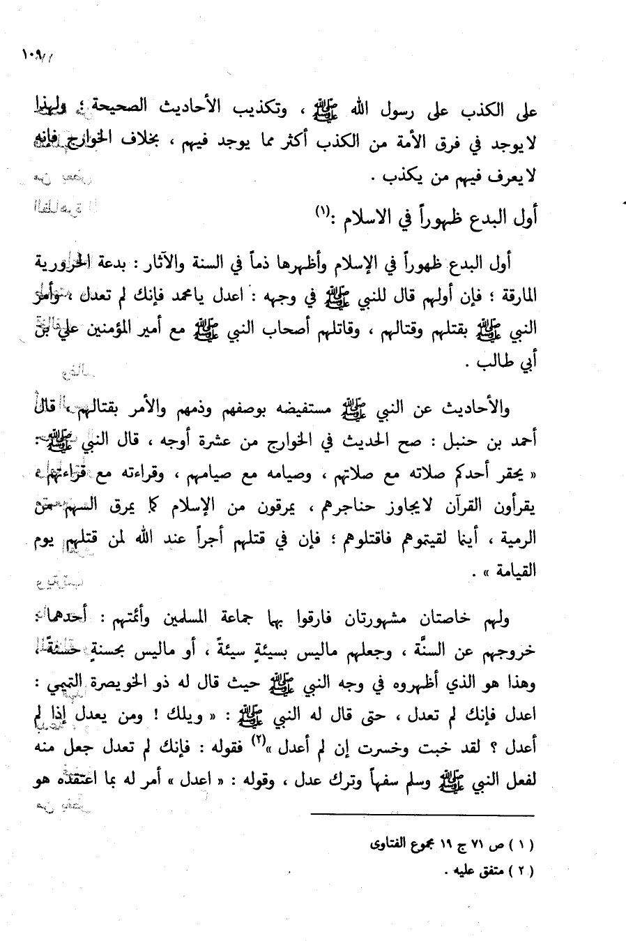 ولهم خاصتان مشهورتان فارقوا بها جماعة المسلمين وأئمتهم: أحدهما: خروجهم من السنة, وجعلهم ما ليس بسيئة سيئة, أو ما ليس بحسنة حسنة, وهذا هو الذي أظهروه في وجه النبي صلى الله عليه وسلم حيث قال له ذو الخويصرة التميمي: اعدل فإنك لم تعدل, حتى قال له النبي صلى الله عليه وسلم: "ويلك, ومن إذا لم أعدل؟ لقد خبت وخسرت إن لم أعدل" 2 فقوله: فإنك لم تعدل جعل منه لفعل النبي صلى الله عليه وسلم سفها وترك عدل, وقوله "اعدل" أمر له بما اعتقده هو