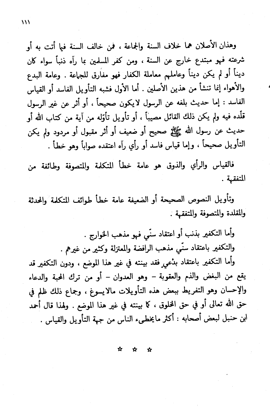 وهذان الأصلان هما خلاف السنة والجماعة, فمن خالف السنة فيما أتت به أو شرعته فهو مبتدع خارج عن السنة, ومن كفر المسلمين بما رآه ذنبا سواء كان دينا أو لم يكن دينا وعاملهم معاملة الكفار فهو مفارق للجماعة, وعامة البدع والأهواء إنما تنشأ من هذين الأصلين. أما الأول فشبه التأويل الفاسد أو القياس الفاسد: إما حديث بلغه عن الرسول لا يكون صحيحا, أو أثر عن غير الرسول قلده فيه ولم يكن ذلك القائل مصيبا, أو تأويل تأوله من آية من كتاب الله أو حديث عن رسول الله صلى الله عليه وسلم صحيح أو ضعيف أو أثر مقبول أو مردود ولم يكن التأويل صحيحا, وإما قياس فاسد أو رأي رآه اعتقده صوابا وهو خطأ.