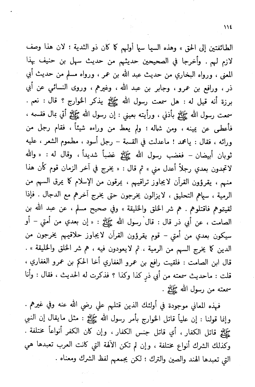 الطائفتين إلى الحق" وهذ السيما سيما أولهم كما كان ذو الثدية, لأن هذا لوصف لازم لهم, وأخرجا في الصحيحين حديثهم من حديث سهل بن حنيف بهذا المعنى, ورواه البخاري من حديث عبد الله بن عمر, ورواه مسلم من حديث أبي ذر, ورافع بن عمرو, وجابر بن عبد الله, وغيرهم, وروى النسائي عن أبي برزة أنه قيل له: هل سمعت رسول الله صلى الله عليه وسلم يذكر الخوارج؟ قال: نعم. سمعت رسول الله صلى الله عليه وسلم بأذني, ورأيته بعيني: إن رسول الله صلى الله عليه وسلم أتي بمال فقسمه, فأعطى عن يمينه, ومن شماله, ولم يعط من وراءه شيئا, فقام رجل من ورائه, فقال: يا محمد! ما عدلت في القسمة –رجل أسود, مطموم الشعر, عليه ثوبان أبيضان- فغضب رسول الله صلى الله عليه وسلم غضبا شديدا, وقال له: "والله لا تجدون بعدي رجلا أعدل مني" ثم قال: "يخرج في آخر الزمان قوم كأن هذا منهم, يقرؤون القرآن لا يجاوز تراقيهم, يمرقون من الإسلام كما سمرق السهم من الرمية, سيماهم التحليق, لا يزالون يخرجون حتى يخرج آخرهم من الدجال. فإذا لقيتموهم فاقتلوهم. هم شر الخلق والخليقة" وفي صحيح مسلم, عن عبد الله بن الصامت, عن أبي ذر قال: قال رسول الله صلى الله عليه وسلم: "إن بعدي من أمتي –أو سيكون بعدي من أمتي- قوم يقرؤون القرآن لا يجاوز حلاقيمهم يخرجون من الدين كما يخرج السهم من الرمية, ثم لا يعودون فيه, هم شر الخلق والخليقة". قال بن صامت: فلقيت رافع بن عمرو الغفاري أخا الحكم بن عمرو الغفاري, قلت: ما حديث سمعته من أبي ذر كذا وكذا؟ فذكرت له الحديث, فقال: وأنا سمعته من رسول الله صلى الله عليه وسلم.
