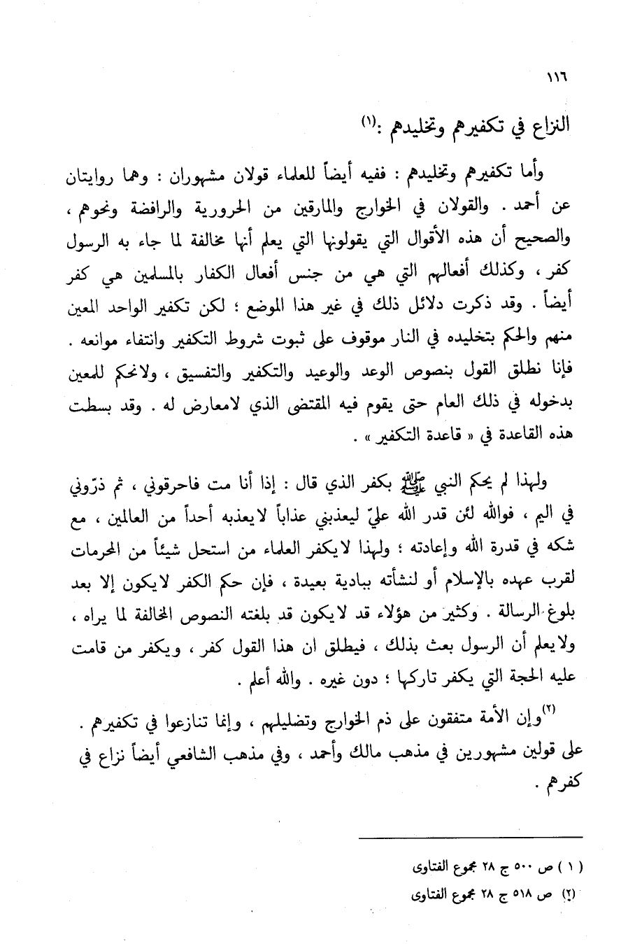 2 وإن الأمة متفقون على ذم الخوارج وتضليلهم, وإنما تنازعوا في تكفيرهم. على قولين مشهورين في مذهب مالك وأحمد, وفي مذهب الشافعي أيضا نزاع في كفرهم