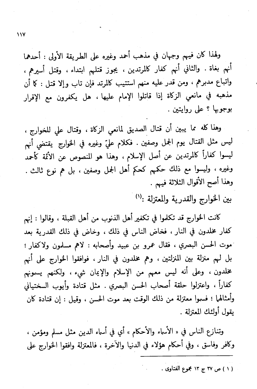 وهذا كله مما يبين أن قتال الصديق لمانعي الزكاة, وقتال علي للخوارج, ليس مثل القتال يوم الجمل وصفين. فكلام علي وغيره في الخوارج يقتضي أنهم ليسوا كفارا كالمرتدين عن أصل الإسلام, وهذا هو المنصوص عن الأئمة كأحمد وغيره, وليسوا مع ذلك حكمهم كحكم أهل الجمل وصفين, بل هم نوع ثالث. وهذا أصح الأقوال الثلاثة فيهم.