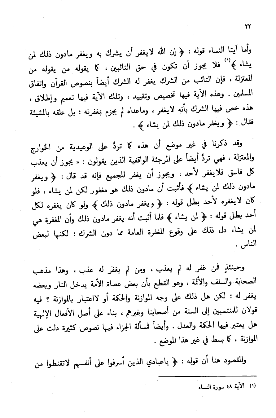 وأما آيتا النساء قوله: {إِنَّ اللَّهَ لا يَغْفِرُ أَنْ يُشْرَكَ بِهِ وَيَغْفِرُ مَا دُونَ ذَلِكَ لِمَنْ يَشَاءُ} 1 فلا يجوز أن تكون في حق التائبين, كما يقوله من يقوله من المعتزلة, فإن التائب من الشرك يغفر له الشرك أيضا بنصوص القرآن واتفاق المسلمين. وهذه الآية فيها تخصيص وتقييد, وتلك الآية فيها تعميم وإطلاق, هذه خص فيها الشرك بأنه لا يغفر, وما عداه لا يجزم بمغفرته, بل علقه بالمشيئة فقال: {وَيَغْفِرُ مَا دُونَ ذَلِكَ لِمَنْ يَشَاءُ} .