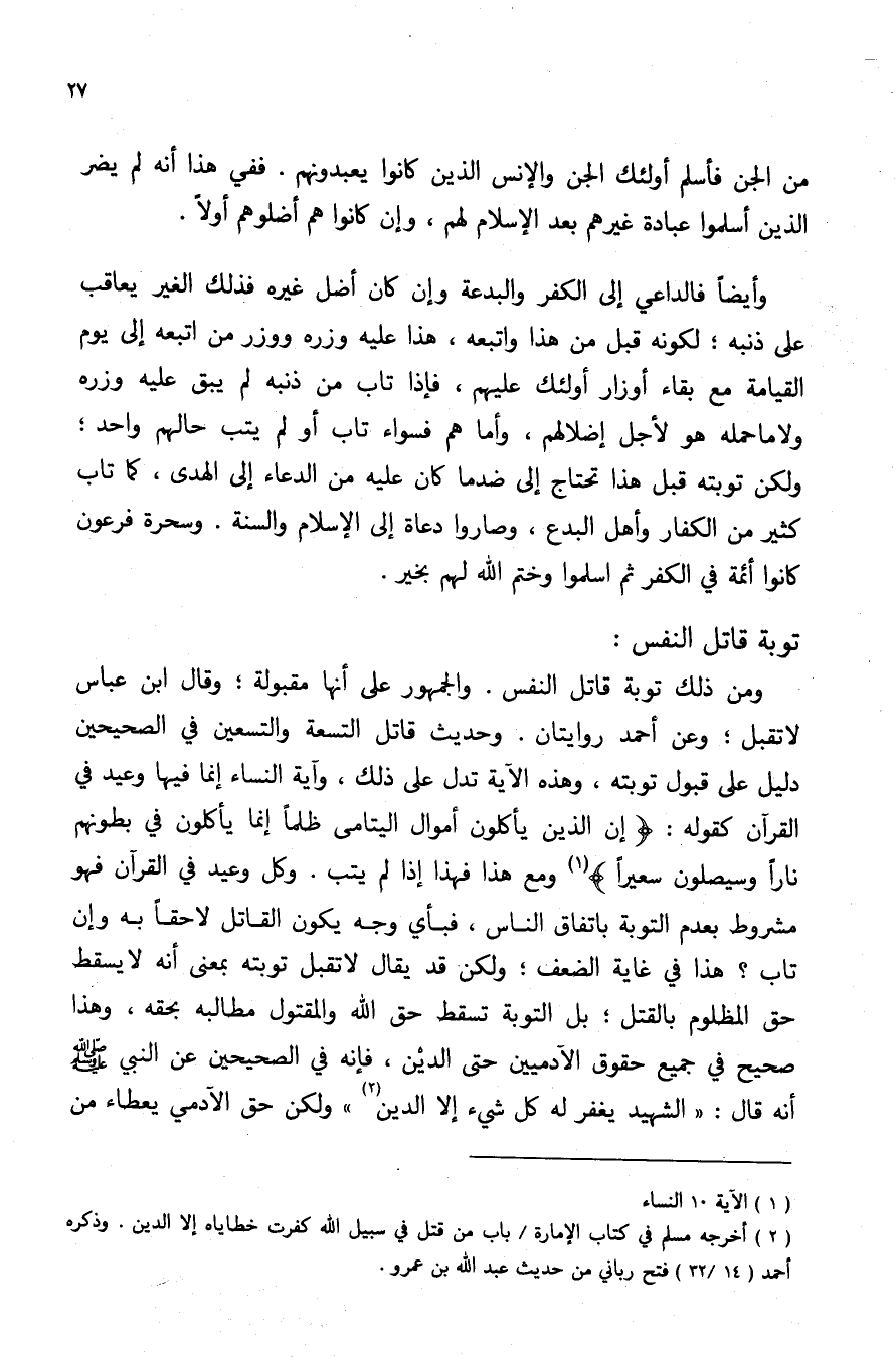 ومن ذلك توبة قاتل النفس. والجمهور على أنها مقبولة, وقال ابن عباس لا تقبل, وعن أحمد روايتان. وحديث قاتل التسعة والتسعين في الصحيحين دليل على قبول توبته, وهذه الآية تدل على ذلك, وآية النساء إنما فيها وعيد في القرآن كقوله: {إِنَّ الَّذِينَ يَأْكُلُونَ أَمْوَالَ الْيَتَامَى ظُلْماً إِنَّمَا يَأْكُلُونَ فِي بُطُونِهِمْ نَاراً وَسَيَصْلَوْنَ سَعِيرا} 1 ومع هذا فهذا إذا لم يتب. وكل وعيد في القرآن فهو مشروط بعدم التوبة باتفاق الناس, فبأي وجه يكون القاتل لاحقا به وإن تاب؟ هذا في غاية الضعف, ولكن قد يقال لا تقبل توبته بمعنى أنه لا يسقط حق المظلوم بالقتل, بل التوبة تسقط حق الله والمقتول مطالبه بحقه, وهذا صحيح في جميع حقوق الآدميين حتى الدين, فإنه في الصحيحين عن النبي صلى الله عليه وسلم أنه قال: "الشهيد يغفر له كل شيء إلا الدين" 2 ولكن حق الآدمي يعطاء من