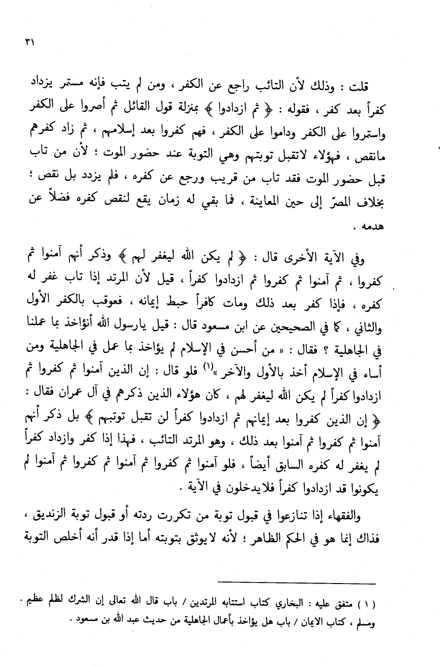 وفي الآية الأخرى قال: {لَمْ يَكُنِ اللَّهُ لِيَغْفِرَ لَهُمْ} وذكر أنهم آمنوا ثم كفروا, ثم آمنوا ثم كفروا ثم ازدادوا كفرا, قيل لأان المرتد إذا تاب غفر له كفره, فإذا كفر بعد ذلك ومات كافرا حبط إيمانه, فعوقب بالكفر الأول والثاني, كما في الصحيحين عن ابن مسعود قال: قبل يا رسول الله أنؤاخذ بما عملنا في الجاهلية؟ فقال: "منم أحسن في الإسلام لم يؤاخذ بما عمل في الجاهلية ومن أساء في الإسلام أخذ بالأول والآخر"1 فلو قال: إن الذين آمنوا ثم كفروا ثم ازدادوا كفرا لم يكن الله ليغفر لهم, كان هؤلاء الذين ذكرهم في آل عمران فقال: {إِنَّ الَّذِينَ كَفَرُوا بَعْدَ إِيمَانِهِمْ ثُمَّ ازْدَادُوا كُفْراً لَنْ تُقْبَلَ تَوْبَتُهُمْ} بل ذكر أنهم آمنوا ثم كفروا ثم آمنوا بعد ذلك, وهو المرتد التائب, فهذا إذا كفر وازداد كفرا لم يغفر له كفره السابق أيضا, فلو آمنوا ثم كفروا ثم آمنوا ثم كفروا ثم آمنوا لم يكونوا قد ازدادوا كفرا فلا يدخلون في الآية.
