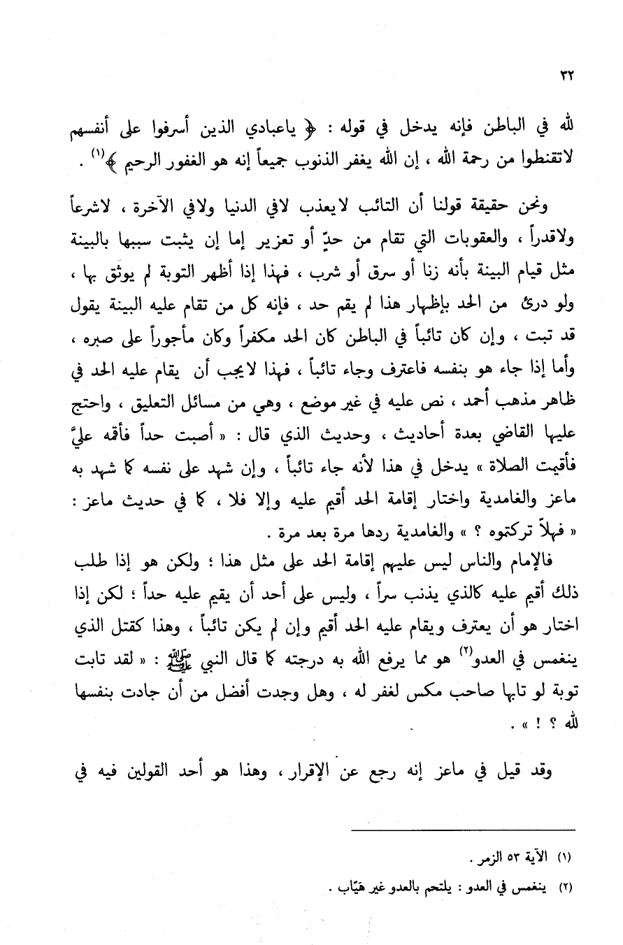 فالإمام والناس ليس عليهم إقامة الحد على مثل هذا, ولكن هو إذا طلب ذلك أقيم عليه كالذي يذنب سرا, وليس على أحد أن يقيم عليه حدا, لكن إذا اختار هو أن يعترف ويقام عليه الحد أقيم وإن لم يكن تائبا, وهذا كالقتل الذي ينغمس في العدو2 هو مما يرفع الله به درجة كما قال النبي صلى الله عليه وسلم: "لقد تابت توبة لو تائب صاحب مكس لغفر له, وهل وجدت أفضل من أن جادت بنفسها لله؟ ".