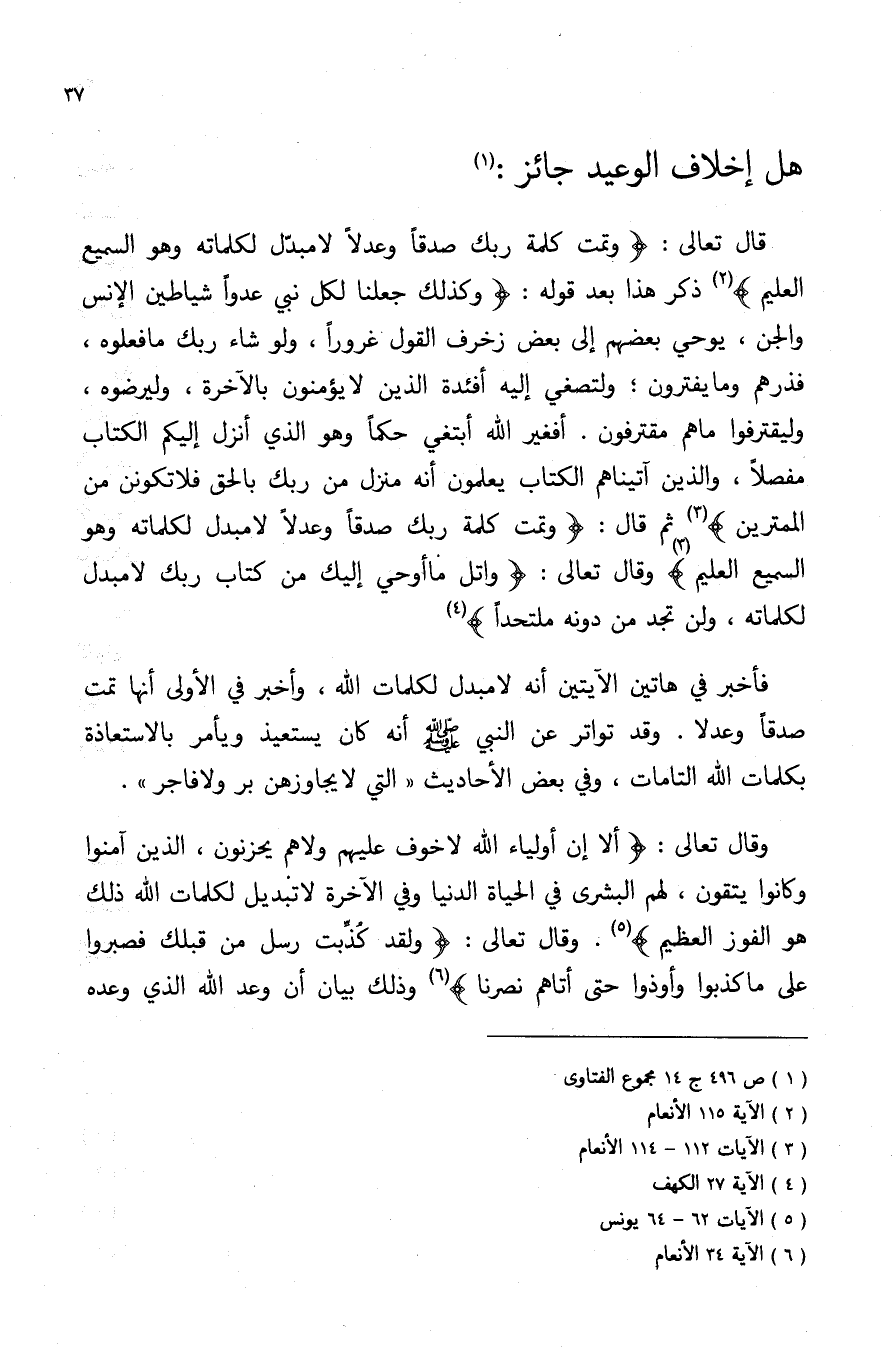 قال تعالى: {وَتَمَّتْ كَلِمَتُ رَبِّكَ صِدْقاً وَعَدْلاً لا مُبَدِّلَ لِكَلِمَاتِهِ وَهُوَ السَّمِيعُ الْعَلِيمُ} 2 ذكر هذا بعد قوله: {وَكَذَلِكَ جَعَلْنَا لِكُلِّ نَبِيٍّ عَدُوّاً شَيَاطِينَ الْأِنْسِ وَالْجِنِّ يُوحِي بَعْضُهُمْ إِلَى بَعْضٍ زُخْرُفَ الْقَوْلِ غُرُوراً وَلَوْ شَاءَ رَبُّكَ مَا فَعَلُوهُ فَذَرْهُمْ وَمَا يَفْتَرُونَ, وَلِتَصْغَى إِلَيْهِ أَفْئِدَةُ الَّذِينَ لا يُؤْمِنُونَ بِالْآخِرَةِ وَلِيَرْضَوْهُ وَلِيَقْتَرِفُوا مَا هُمْ مُقْتَرِفُونَ, أَفَغَيْرَ اللَّهِ أَبْتَغِي حَكَماً وَهُوَ الَّذِي أَنْزَلَ إِلَيْكُمُ الْكِتَابَ مُفَصَّلاً وَالَّذِينَ آتَيْنَاهُمُ الْكِتَابَ يَعْلَمُونَ أَنَّهُ مُنَزَّلٌ مِنْ رَبِّكَ بِالْحَقِّ فَلا تَكُونَنَّ مِنَ الْمُمْتَرِينَ} 3 ثم قال: {وَتَمَّتْ كَلِمَتُ رَبِّكَ صِدْقاً وَعَدْلاً لا مُبَدِّلَ لِكَلِمَاتِهِ وَهُوَ السَّمِيعُ الْعَلِيمُ} وقال تعالى: {وَاتْلُ مَا أُوحِيَ إِلَيْكَ مِنْ كِتَابِ رَبِّكَ لا مُبَدِّلَ لِكَلِمَاتِهِ وَلَنْ تَجِدَ مِنْ دُونِهِ مُلْتَحَداً} 4.