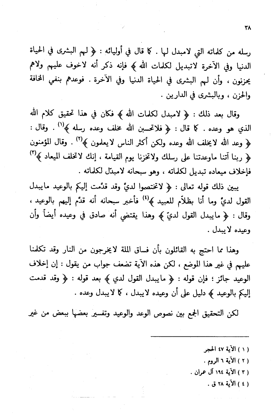 وقال بعد ذلك: {لا مبدل لكلمات الله} فكان في هذا تحقيق كلام الله الذي هو وعده, كما قال: {فَلا تَحْسَبَنَّ اللَّهَ مُخْلِفَ وَعْدِهِ رُسُلَهُ} 1. وقال: {وَعْدَ اللَّهِ لا يُخْلِفُ اللَّهُ وَعْدَهُ وَلَكِنَّ أَكْثَرَ النَّاسِ لا يَعْلَمُونَ} 2. وقال المؤمنون: {رَبَّنَا وَآتِنَا مَا وَعَدْتَنَا عَلَى رُسُلِكَ وَلا تُخْزِنَا يَوْمَ الْقِيَامَةِ إِنَّكَ لا تُخْلِفُ الْمِيعَادَ} 3 فإخلاف ميعاده تبديل لكماته.