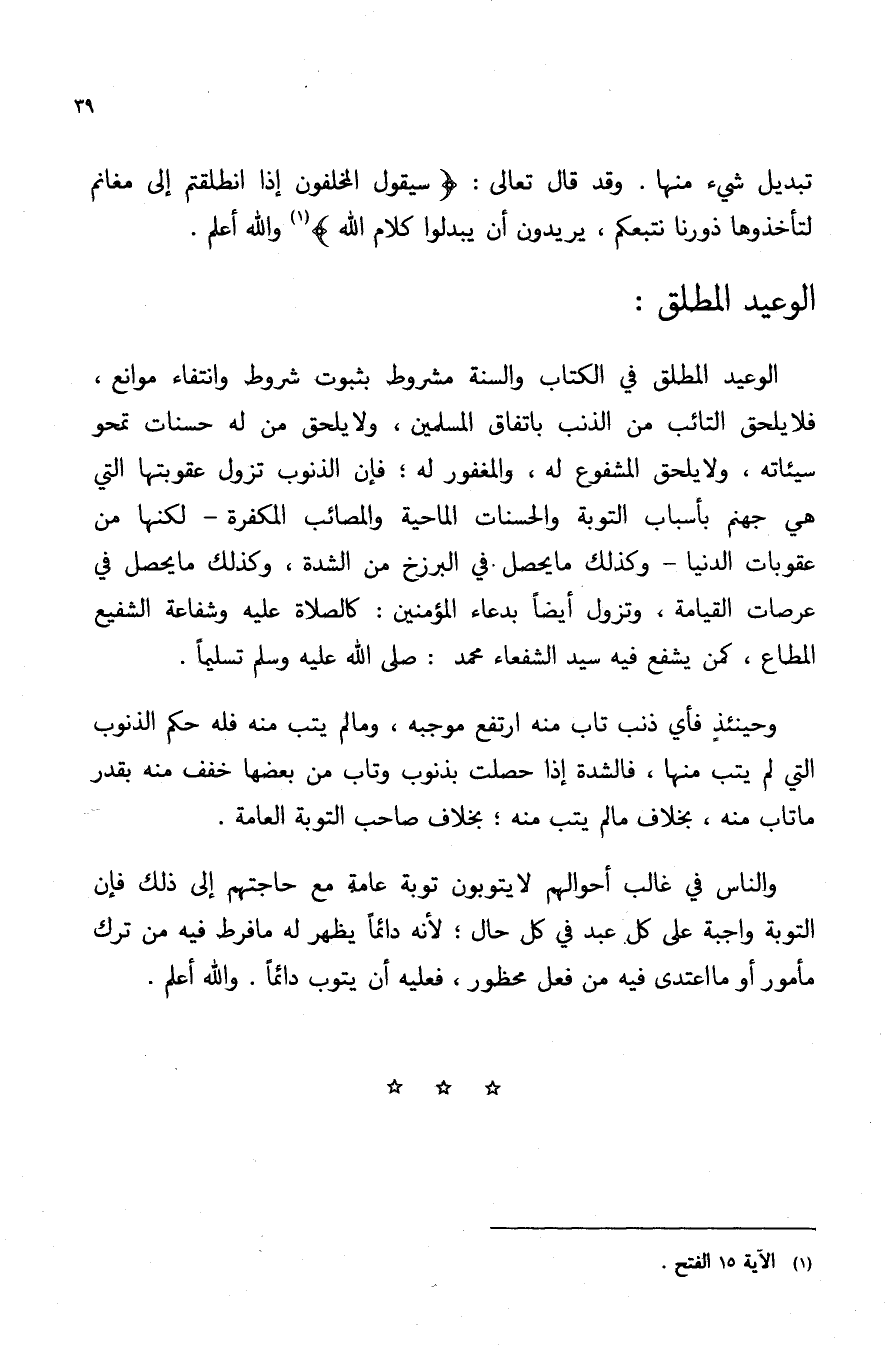 الوعيد المطلق في الكتاب والسنة مشروط بثبوت شروط وانتفاء موانع, فلا يلحق التائب من الذنب باتفاق المسلمين, ولا يلحق من له حسنات تمحو سيئاته, ولا يلحق المشفوع له, والمغفور له, فإن الذنوب تزول عقوبتها التي هي جهنم بأسباب التوبة والحسنات الماحية والمصائب المكفرة –لكنها من عقوبات الدنيا- وكذلك ما يحصل في البرزخ من الشدة, وكذلك ما يحصل في عرصات القيامة, وتزول أيضا بدعاء المؤمنين: كالصلاة عليه وشفاعة الشفيع المطاع, كمن يشفع فيه سيد الشفعاء محمد: صلى الله عليه وسلم تسليما.