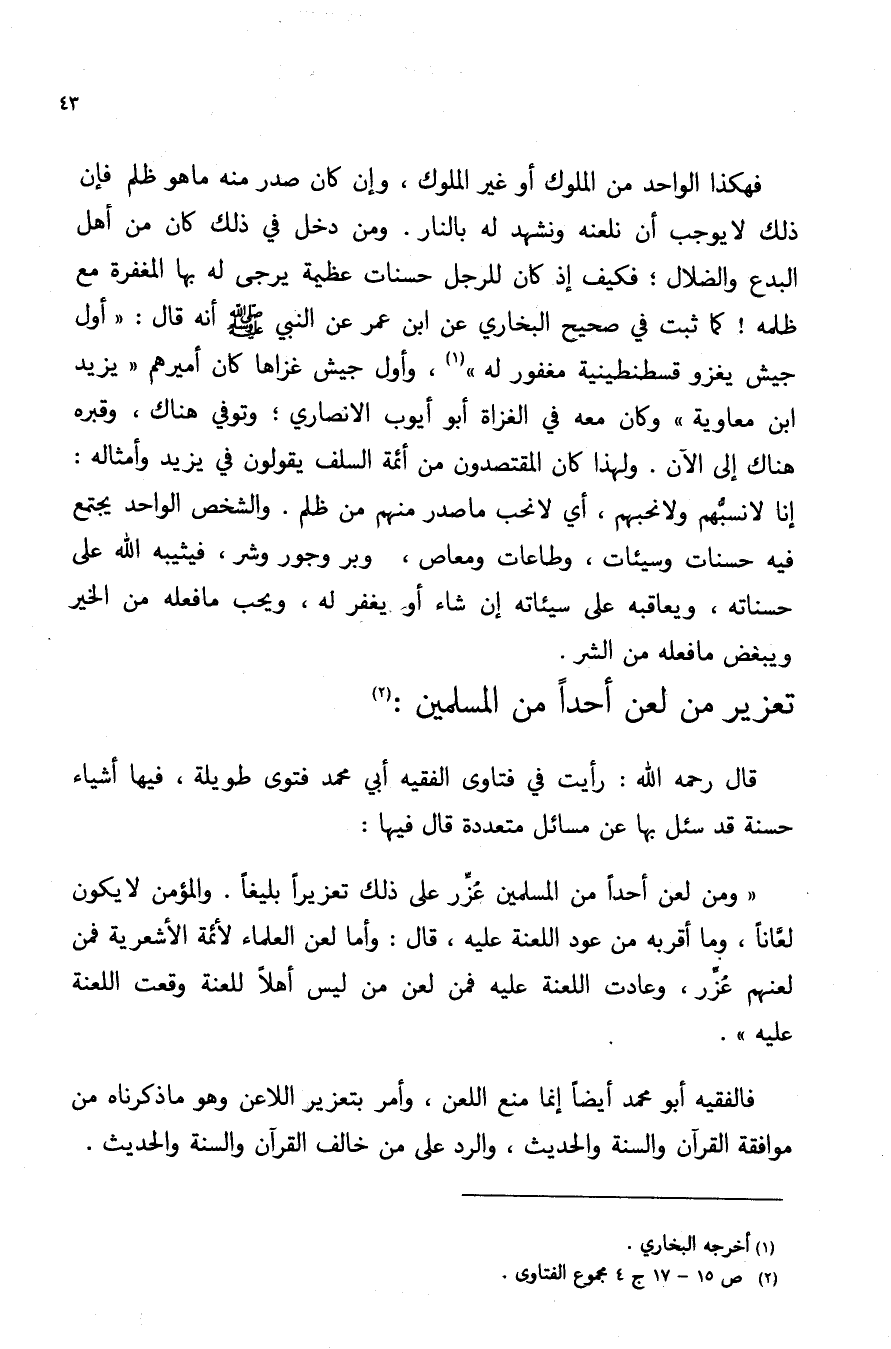 "ومن لعن أحدا من المسلمين عزر ذلك تعزيرا بليغا, والمؤمن لا يكون لعانا, وما أقربه من عود اللعنة عليه, قال: وأما لعن العلماء لأئمة الأشعرية فمن لعنهم عز, وعادت اللعنة عليه فمن لعن من ليس أهلا للعنة وقعت اللعنة عليه".