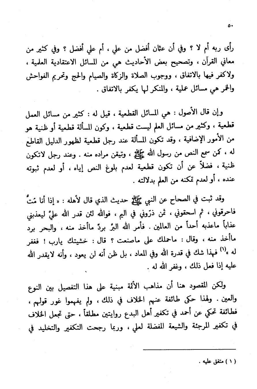 رأى ربه أم لا؟ وفي أن عثمان أفضل من علي, أم علي أفضل؟ وفي كثير من معاني القرآن, وتصحيح بعض الأحاديث هي من المسائل الاعتقادية العلمية, ولا كفر فيها بالاتفاق, ووجوب الصلاة والزكاة والصيام والحج وتحريم الفواحش والخمر هي مسائل عملية, والمنكر لها يكفر بالاتفاق.