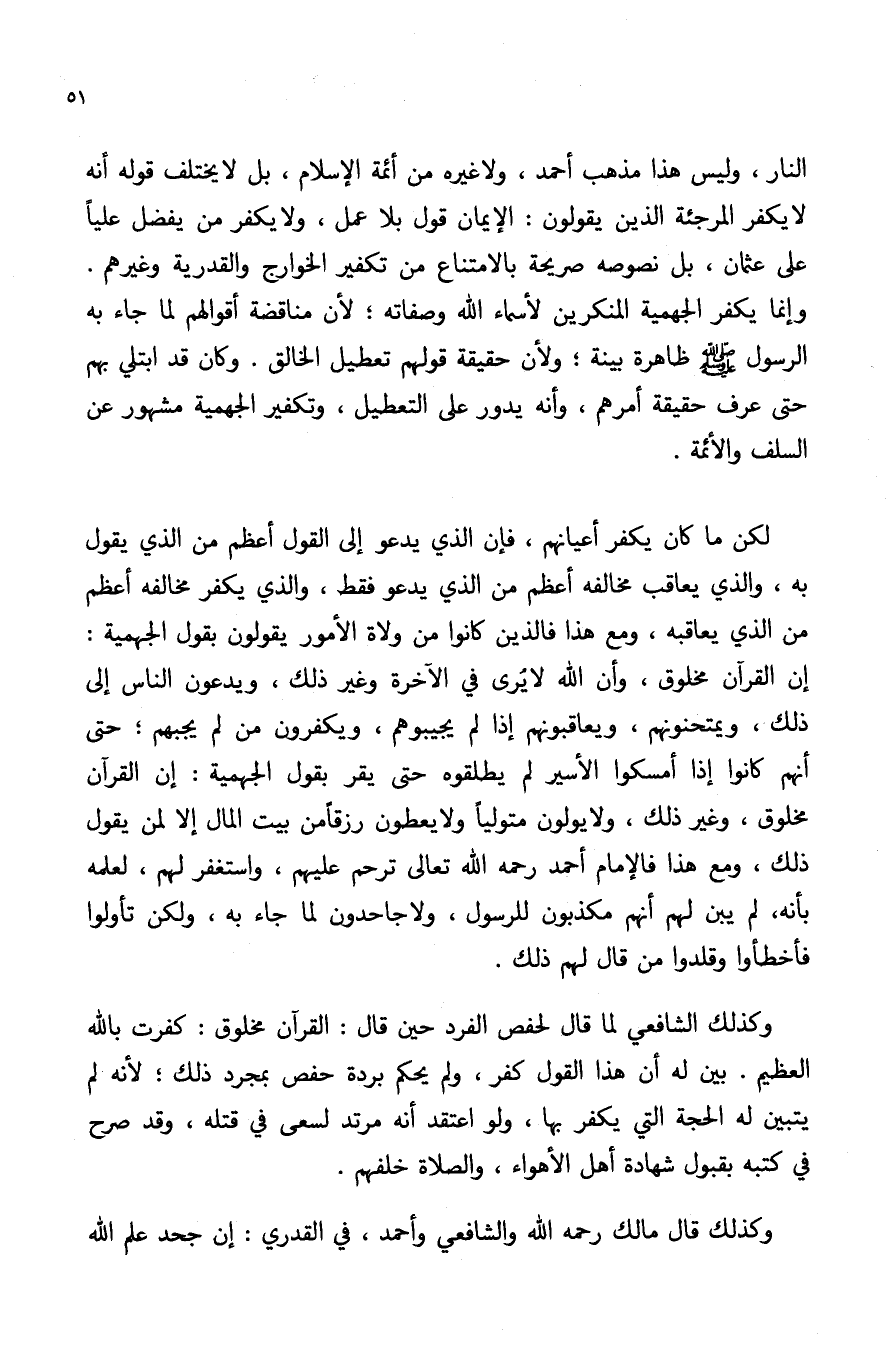 النار, وليس هذا مذهب أحمد, ولا غيره من أئمة الإسلام, بل لا يختلف قوله أنه لا يكفر المرجئة الذين يقولون: الإيمان قول بلا عمل, ولا يكفر من يفضل عليا على عثمان, بل نصوصه صريحة بالامتناع من تكفير الخوارج والقدرية وغيرهم. وإنما يكفر الجهمية المنكرين لأسماء الله وصفاته, لان مناقضة أقوالهم لما جاء به الرسول صلى الله عليه وسلم ظاهرة بينة, ولأن حقيقة قولهم تعطيل الخالق. وكان قد ابتلي بهم حتى عرف حقيقة أمرهم, وأنه يدور على التعطيل, وتكفير الجهمية مشهور عن السلف والأئمة.