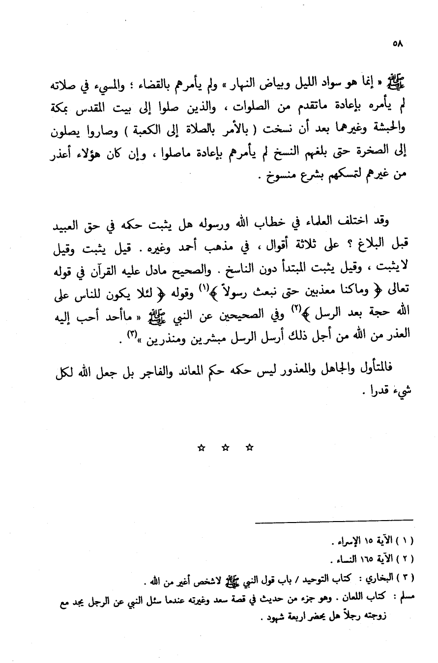 وقد اختلف العلماء في خطاب الله ورسوله هل يثبت حكمه في حق العبيد قبل البلاغ؟ علل ثلاثة أقوال, في مذهب أحمد وغيره. قيل يثبت وقيل لا يثبت, وقيل يثبت المبتدأ دون الناسخ, والصحيح ما دل عليه القرآن في قوله تعالى: {وَمَا كُنَّا مُعَذِّبِينَ حَتَّى نَبْعَثَ رَسُولاً} 1 وقوله: {لِئَلَّا يَكُونَ لِلنَّاسِ عَلَى اللَّهِ حُجَّةٌ بَعْدَ الرُّسُلِ} 2 وفي الصحيحين عن النبي صلى الله عليه وسلم "ما أحد أحب إليه العذر من الله من أجل ذلك أرسل الرسل مبشرين ومنذرين" 3.