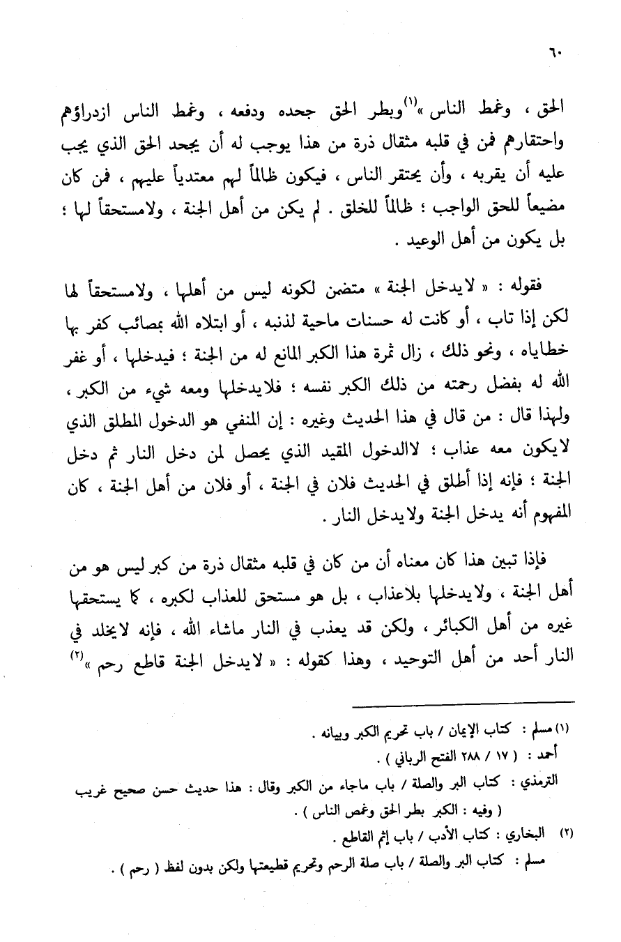 فإذا تبين هذا كان معناه أن من كان في قلبه مثقال ذرة من كبر ليس هو من أهل الجنة, ولا يدخلها بلا عذاب, بل هو مستحق للعذاب لكبره, كما يستحقها غيره من أهل الكبائر, ولكن قد يعذب في النار ما شاء الله, فإنه لا يخلد في النار احد من أهل التوحيد, وهذا كقوله: "لا يدخل الجنة قاطع رحم" 2