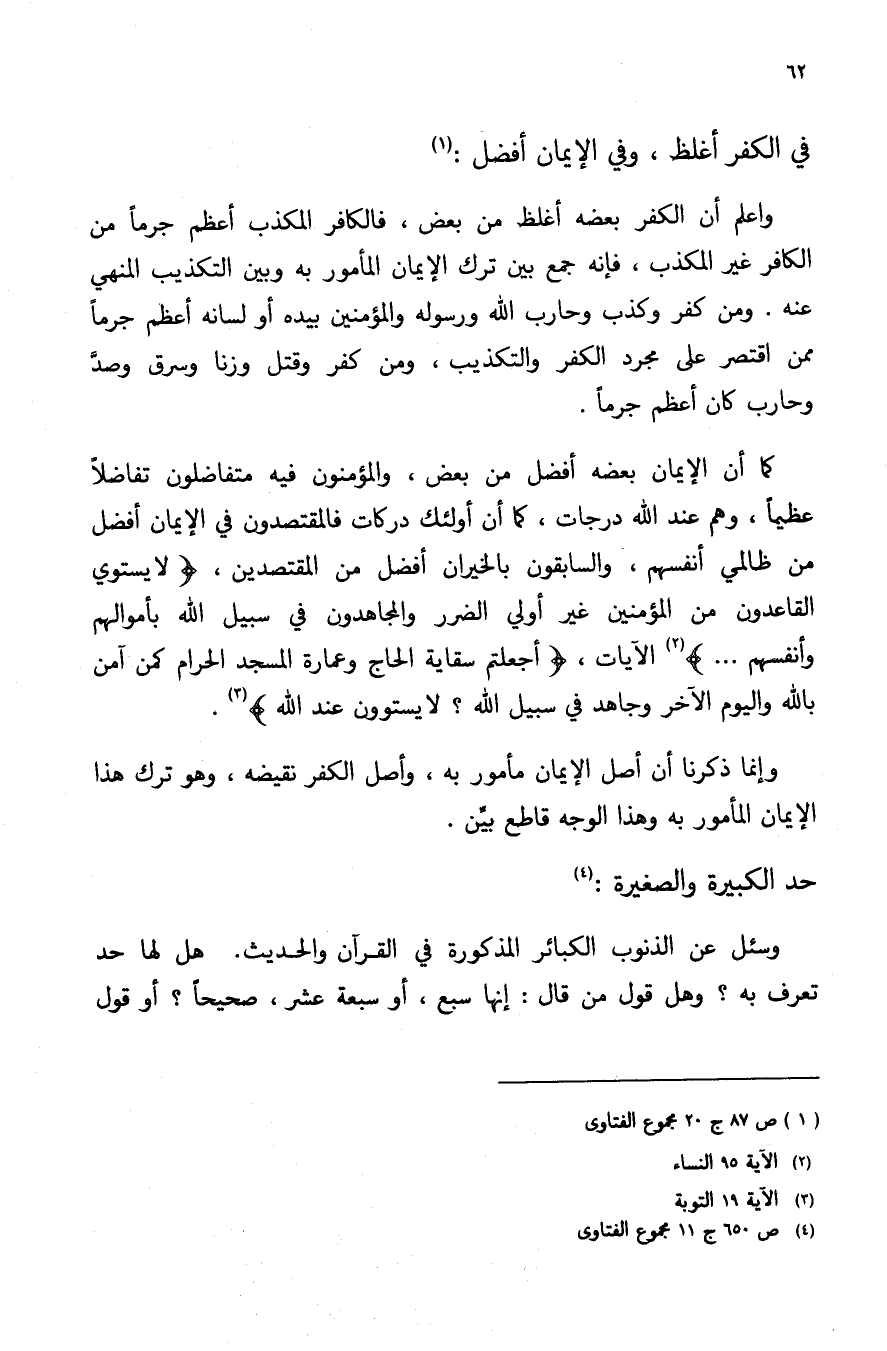 كما أن الإيمان بعضه أفضل من بعض, والمؤمنون فيه متفاضلون تفاضلا عظيما, وهم عند الله درجات, كما أن أولئك دركات فالمقتصدون في الإيمان أفضل من ظالمي أنفسهم, والسابقون بالخيرات أفضل من المقتصدين, {لا يَسْتَوِي الْقَاعِدُونَ مِنَ الْمُؤْمِنِينَ غَيْرُ أُولِي الضَّرَرِ وَالْمُجَاهِدُونَ فِي سَبِيلِ اللَّهِ بِأَمْوَالِهِمْ وَأَنْفُسِهِمْ ... } 2 الآيات, {أَجَعَلْتُمْ سِقَايَةَ الْحَاجِّ وَعِمَارَةَ الْمَسْجِدِ الْحَرَامِ كَمَنْ آمَنَ بِاللَّهِ وَالْيَوْمِ الْآخِرِ وَجَاهَدَ فِي سَبِيلِ اللَّهِ؟ لا يَسْتَوُونَ عِنْدَ اللَّهِ} 3.