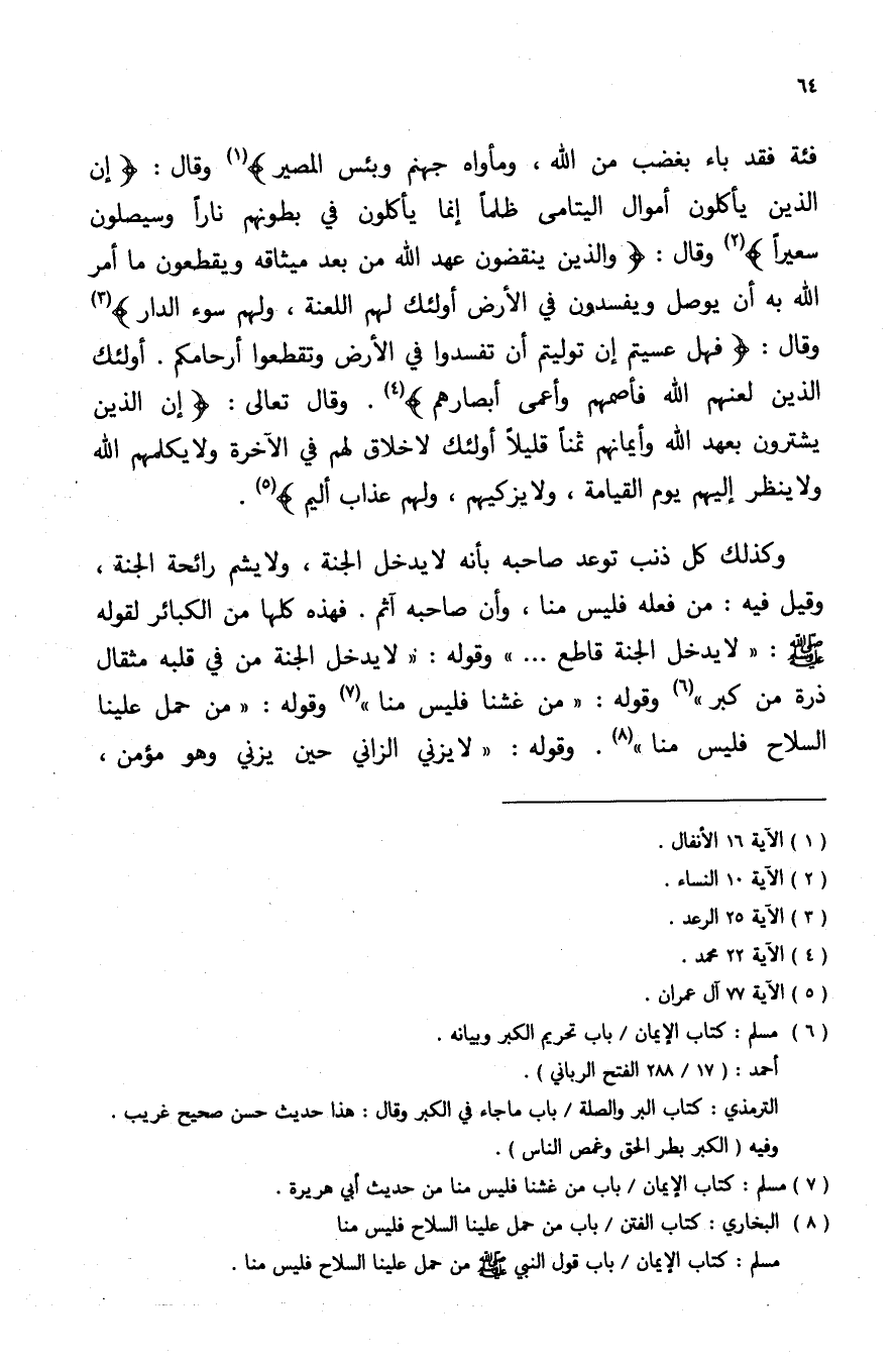 فِئَةٍ فَقَدْ بَاءَ بِغَضَبٍ مِنَ اللَّهِ وَمَأْوَاهُ جَهَنَّمُ وَبِئْسَ الْمَصِيرُ} 1 وقال: {إِنَّ الَّذِينَ يَأْكُلُونَ أَمْوَالَ الْيَتَامَى ظُلْماً إِنَّمَا يَأْكُلُونَ فِي بُطُونِهِمْ نَاراً وَسَيَصْلَوْنَ سَعِيراً} 2 وقال: {وَالَّذِينَ يَنْقُضُونَ عَهْدَ اللَّهِ مِنْ بَعْدِ مِيثَاقِهِ وَيَقْطَعُونَ مَا أَمَرَ اللَّهُ بِهِ أَنْ يُوصَلَ وَيُفْسِدُونَ فِي الْأَرْضِ أُولَئِكَ لَهُمُ اللَّعْنَةُ وَلَهُمْ سُوءُ الدَّارِ} 3 وقال: {فَهَلْ عَسَيْتُمْ إِنْ تَوَلَّيْتُمْ أَنْ تُفْسِدُوا فِي الْأَرْضِ وَتُقَطِّعُوا أَرْحَامَكُمْ, أُولَئِكَ الَّذِينَ لَعَنَهُمُ اللَّهُ فَأَصَمَّهُمْ وَأَعْمَى أَبْصَارَهُمْ} 4. وقال تعالى: {إِنَّ الَّذِينَ يَشْتَرُونَ بِعَهْدِ اللَّهِ وَأَيْمَانِهِمْ ثَمَناً قَلِيلاً أُولَئِكَ لا خَلاقَ لَهُمْ فِي الْآخِرَةِ وَلا يُكَلِّمُهُمُ اللَّهُ وَلا يَنْظُرُ إِلَيْهِمْ يَوْمَ الْقِيَامَةِ وَلا يُزَكِّيهِمْ وَلَهُمْ عَذَابٌ أَلِيمٌ} 5.
