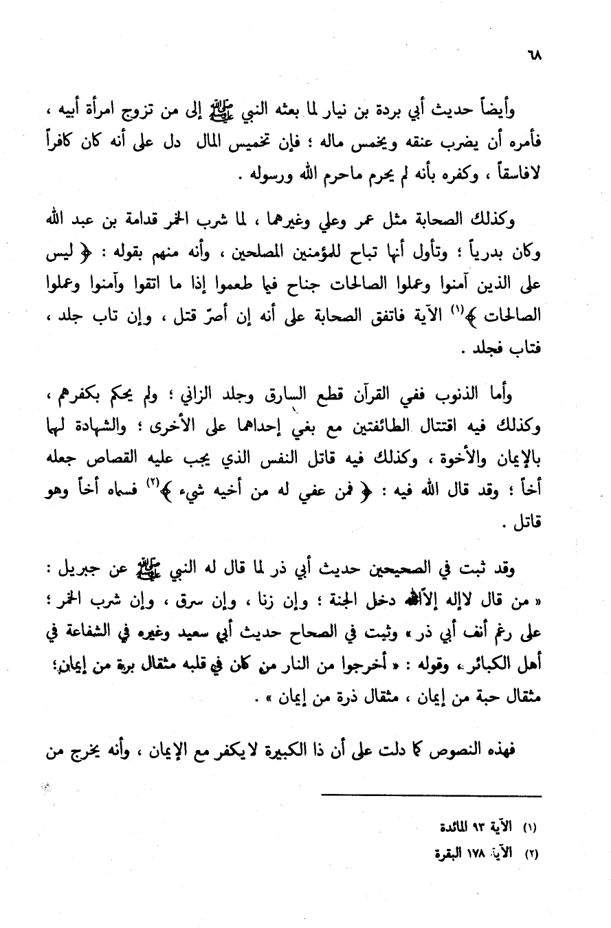 وأما الذنوب في القرآن قطع السارق وجلد الزاني, ولم يحكم بكفرهم, وكذلك فيه اقتتال الطائفتين مع بغي أحدهما على الأخرى, والشهادة لهما بالإيمان والأخوة, وكذلك فيه قاتل النفس الذي يجب عليه القصاص جعله أخا, وقد قال الله فيه: {فَمَنْ عُفِيَ لَهُ مِنْ أَخِيهِ شَيْءٌ} 2 فسماه أخا وهو قاتل.