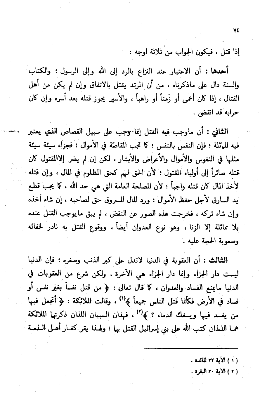 الثاني: أن ما وجب فيه القتال إنما وجب على سبيل القصاص الذي يعتبر فيه المماثلة, فإن النفس بالنفس, كما تجب المقاصة في الأموال, فجزاء السيئة سيئة مثلها في النفوس والأموال والأعراض الأبشار, لكن إن لم يضر إلا المقتول كان قتله صائرا إلى أولياء المقتول, لأن الحق لهم كحق المظلوم من المال, وإن قتله لأخذ المال كان قتله واجبا, لأن المصلحة العامة التي هي حد الله, كما يجب قطع يد السارق لأجل حفظ الأموال, ورد المال المسروق حق لصاحبه, إن شاء أخذه وإن شاء تركه, فخرجت هذه الصور عن النقض, لم يبق ما يوجب القتل عنده بلا مماثلة إلا الزنا, وهو نوع العدوان أيضا, ووقوع القتل به نادرا لخفائه وصعوبة الحجة عليه.