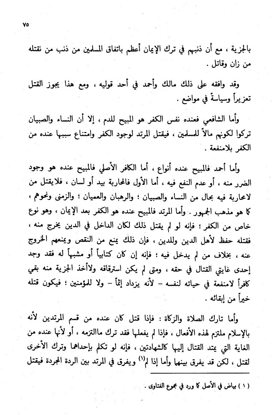 وأما تارك الصلاة والزكاة: فإذا قتل كان عنده من قسم المرتدين لأنه بالإسلام ملتزم لهذه الأفعال, فإذا لم يفعلها فقد ترك التزمه, أو لا، ها عنده من الغاية التي يمتد القتال إليها كالشهادتين, فإنه لو تكلم بإحداهما وترك الأخرى لقتل, لكن قد يفرق بينهما وأما إذا لم1 ويفرق في المرتد بين الرد المجردة فيقتل