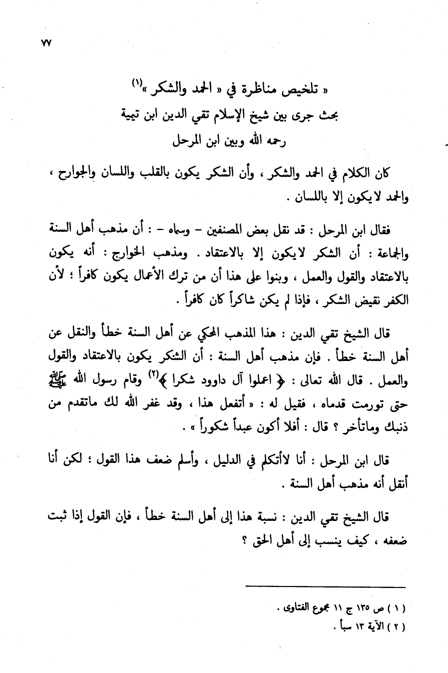 قال الشيخ تقي الدين: هذا المذهب المحكي عن أهل السنة خطأ والنقل عن أهل السنة خطأ. فإن مذهب أهل السنة: أن الشكر يكون بالاعتقاد والقول والعمل. قال الله تعالى: {اعْمَلُوا آلَ دَاوُدَ شُكْراً} 2 وقام رسول الله صلى الله عليه وسلم حتى تورمت قدماه, فقيل له: "أتفعل هذا, وقد غفر الله لك ما تقدم من ذنبك وما تأخر؟ قال: "أفلا أكون عبدا شكورا".