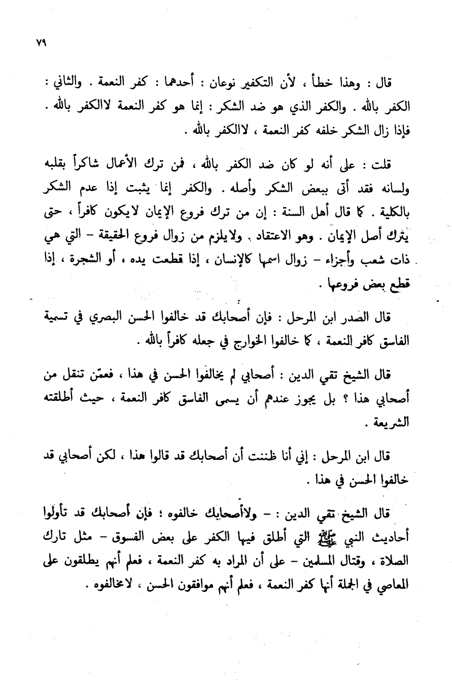 قال الشيخ تقي الدين: -ولا أصحابك خالفوه, فإن أصحابك قد تأولوا أحاديث النبي صلى الله عليه وسلم التي أطلق فيها الكفر على بعض الفسوق- مثل تارك الصلاة, وقتال المسلمين –على أن المراد به كمفر النعمة, فعلم أنهم يطلقون على المعاصي في الجملة أنها كفر النعمة, فعلم أنهم موافقون الحسن, لا مخالفوه.