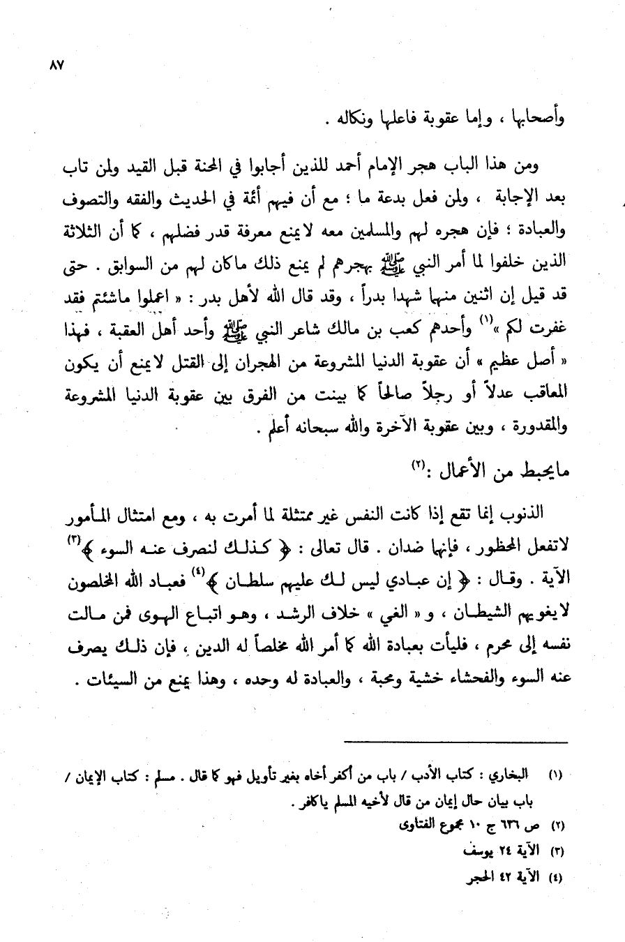 ومن هذا الباب هجر الإمام أحمد للذين أجابوا في المحنة قبل القيد ولمن تاب بعد الإجابة, ولمن فعل بدعة ما, مع أن فيهم أئمة في الحديث والفقه والتصوف والعبادة, فإن هجره لهم والمسلمين معه لا يمنع معرفة قدر فضلهم, كما أن الثلاثة الذين خلفوا لما أمر النبي صلى الله عليه وسلم بهجرهم لم يمنع ذلك ما كان لهم من السوابق, حتى قد قيل إن الاثنين منهما شهدا بدرا, وقد قال الله لأهل بدر: "اعملوا ما شئتم فقد غفرت لكم" 1 وأحدهم كعب بن مالك شاعر النبي صلى الله عليه وسلم وأحد أهل العقبة, فهذا "أصل عظيم" أن عقوبة الدنيا المشروعة من الهجران إلى القتل لا يمنع أن يكون المعاقب عدلا أو رجلا صالحا كما بينت من الفرق بين عقوبة الدنيا المشروعة والمقدورة, وبين عقوبة الآخرة والله سبحانه أعلم.