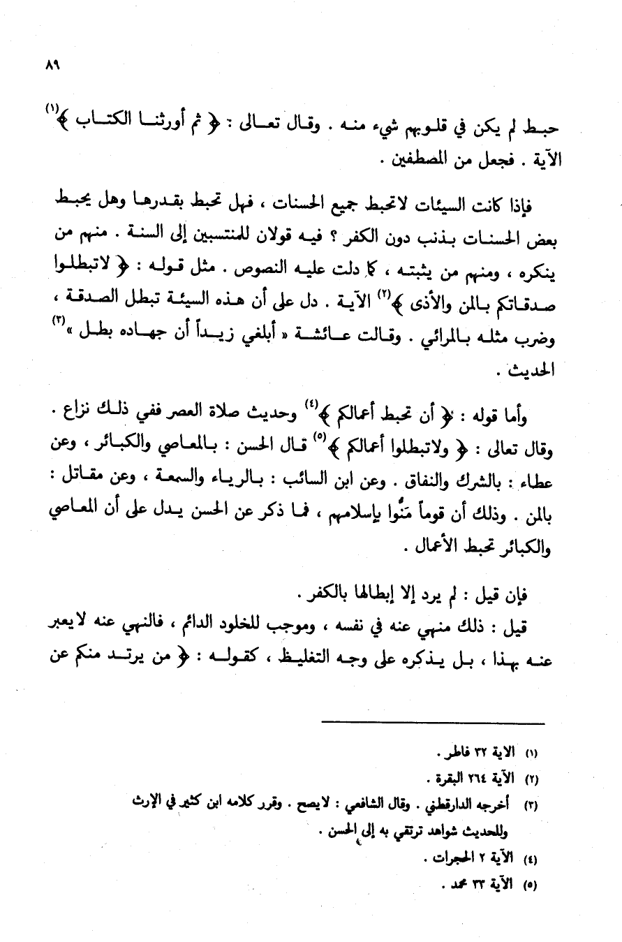 وأما قوله: {أَنْ تَحْبَطَ أَعْمَالُكُم} 4 وحديث صلاة العصر ففي ذلك نزاع. وقال تعالى: {وَلا تُبْطِلُوا أَعْمَالَكُمْ} 5 قال الحسن: بالمعاصي والكبائر, وعن عطاء: بالشرك والنفاق. وعن ابن السائب: بالرياء والسمعة, وعن مقاتل: بالمن. وذلك أن قوما منوا بإسلامهم, فما ذكر عن الحسن يدل على أن المعاصي والكبائر تحبط الأعمال.