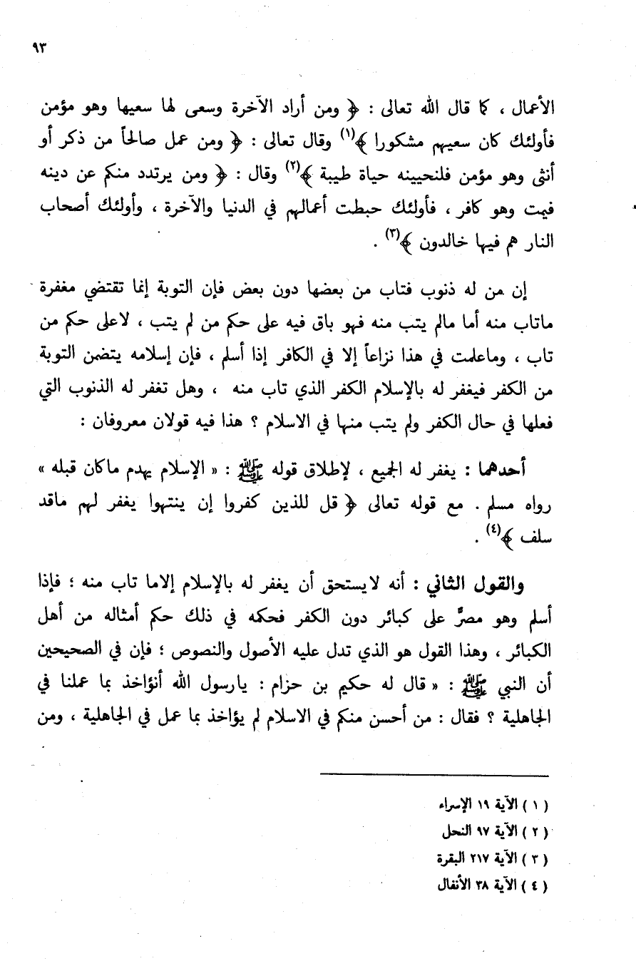 والقول الثاني: أنه لا يستحق أن يغفر له الإسلام إلا ما تاب منه, فإذا أسلم وهو مصر على كبائر دون الكفر فحكمه في ذلك حكم أمثاله من أهل الكبائر. وهذا القول هو الذي تدل عليه الأصول والنصوص, فإن في الصحيحين أن النبي صلى الله عليه وسلم: "قال له حكيم بن حزام: يا رسول الله أنؤاخذ بما عملنا في الجاهلية؟ فقال: "من أحسن منكم في الإسلام لم يؤاخذ بما عمل في الجاهلية, ومن