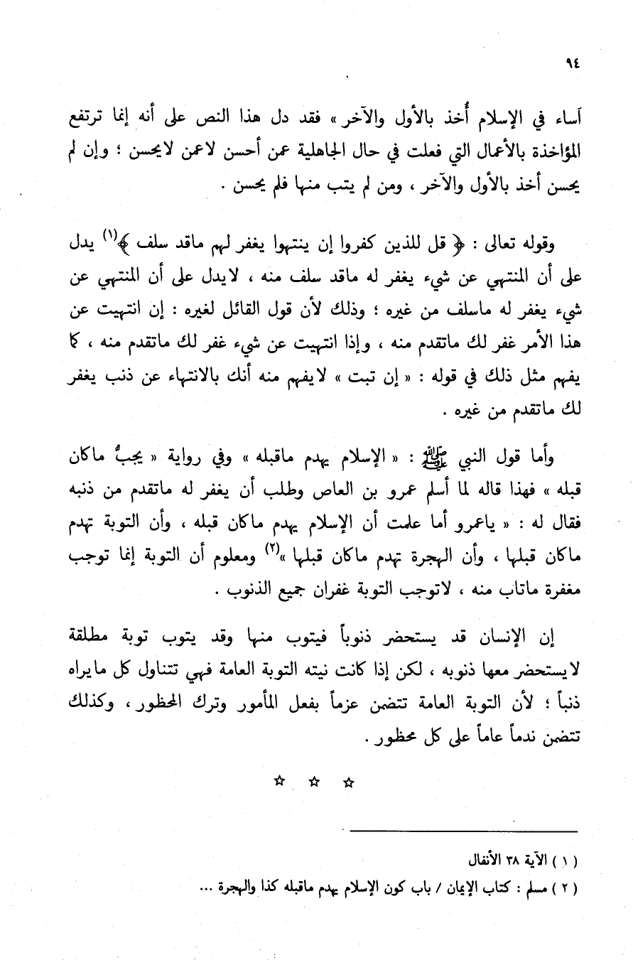 وأما قول النبي صلى الله عليه وسلم: "الإسلام يهدم ما قبله" وفي رواية "يجب ما كان قبله" فهذا قاله لما أسلم عمرو بن العاص وطلب أن يغفر له ما تقدم من ذنبه فقال له: "يا عمرو أما علمت أن الإسلام يهدم ما كان قبله, وأن التوبة تهدم ما كان قبلها, وأن الهجرة تهدم ما كان قبلها" 2 ومعلوم أن التوبة إنما توجب مغفرة ما تاب منه, لا توجب التوبة غفران جميع الذنوب.
