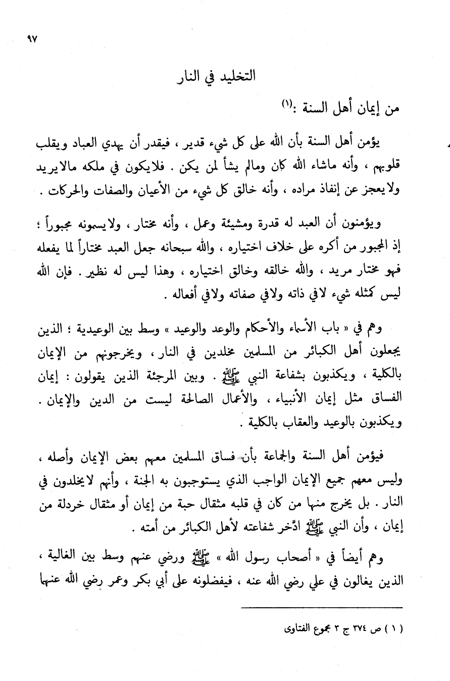 ويؤمنون أن العبد له قدرة ومشيئة وعمل, وأنه مختار, ولا يسمونه مجبورا, إذ المجبور من أكره على خلاف اختياره, والله سبحانه جعل العبد مختارا لما يفعله فهو مختار مريد, والله خالقه وخالق اختياره, وهذا ليس له نظير. فإن الله ليس كمثله شيء لا في ذاته ولا في صفاته ولا في أفعاله.