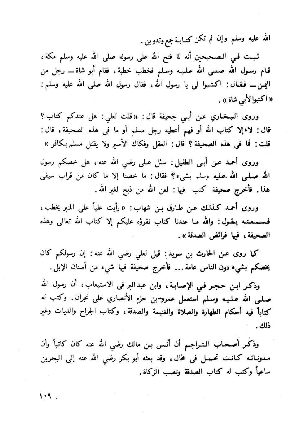 وروى البخاري عن أبي جحيفة قال: "قلت لعلي" هي عندكم كتاب؟ قال: لا، إلا كتاب الله أو فهم أعطيه رجل مسلم أو ما في هذه الصحيفة، قال: قلت: فما في هذه الصحيفة؟ قال: العقل وفكاك الأسير ولا يقتل مسلم بكافر".