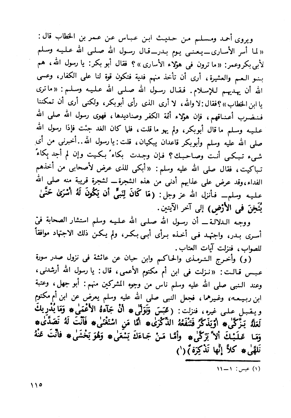 ويروى أحمد ومسلم من حديث ابن عباس عن عمر بن الخطاب قال: "لما أسر الأسارى يعني يوم بد قال رسول الله صلى الله عليه وسلم لأبي وعمر: "ما ترون في هؤلاء الأسارى"؟ فقال أبو بكر: يا رسول الله، هم بنو العم والعشيرة، أرى أن تأخذ منهم فدية فتكون قوة لنا على الكفار، وعسى الله أن يهديهم للإسلام. فقال رسول الله صلى الله عليه وسلم: "ما ترى يا بان الخطاب"؟ فقال: لا والله، لا أرى الذي رأي أبو بكر، ولكني أرى أن تمكننا فنضرب أعناقهم، فإن هؤلاء أئمة الك وصناديدها، فهوى رسول الله صلى الله عليه وسلم ما قال أبو بكر، ولم يهو ما قلت، فلما كان الغد جئت فإذا رسول الله صلى الله عليه وسلم وأبو بكر قاعدان يبكيان، قلت: يا رسول الله ... أخبرني من أي شيء تبكي أنت وصاحبك؟ فإن وجدت بكاء بكيت وإن لم أجد بكاء تباكيت، فقال صلى الله عليه وسلم: "أبكي للذي عرض لأصحابي من أخذهم الفداء، وقد عرض على عذابهم أدنى من هذه الشجرة" - لشجرة قريبية منه صلى الله عليه وسلم فأنزل الله عز وجل: {مَا كَانَ لِنَبِيٍّ أَنْ يَكُونَ لَهُ أَسْرَى حَتَّى يُثْخِنَ فِي الْأَرْضِ} إلى آخر الآيتين.