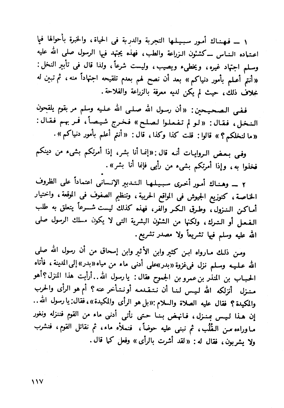 2- وهناك أمور أخرى سبيلها التدبير الإنساني اعتمادا على الظروف الخاصة، كتوزيع الجيوش في المواقع الحربية، وتنظيم الصفوف في الموقعة، واختيار أماكن النزول، وطرق الكر والفر، فهذه كذلك ليست شرعا يتعلق به طلب الفعل أو الترك، ولكنها من الشئون البشرية التي لا يكون مسلك الرسول صلى الله عليه وسلم فيها تشريعا ولا مصدر تشريع.