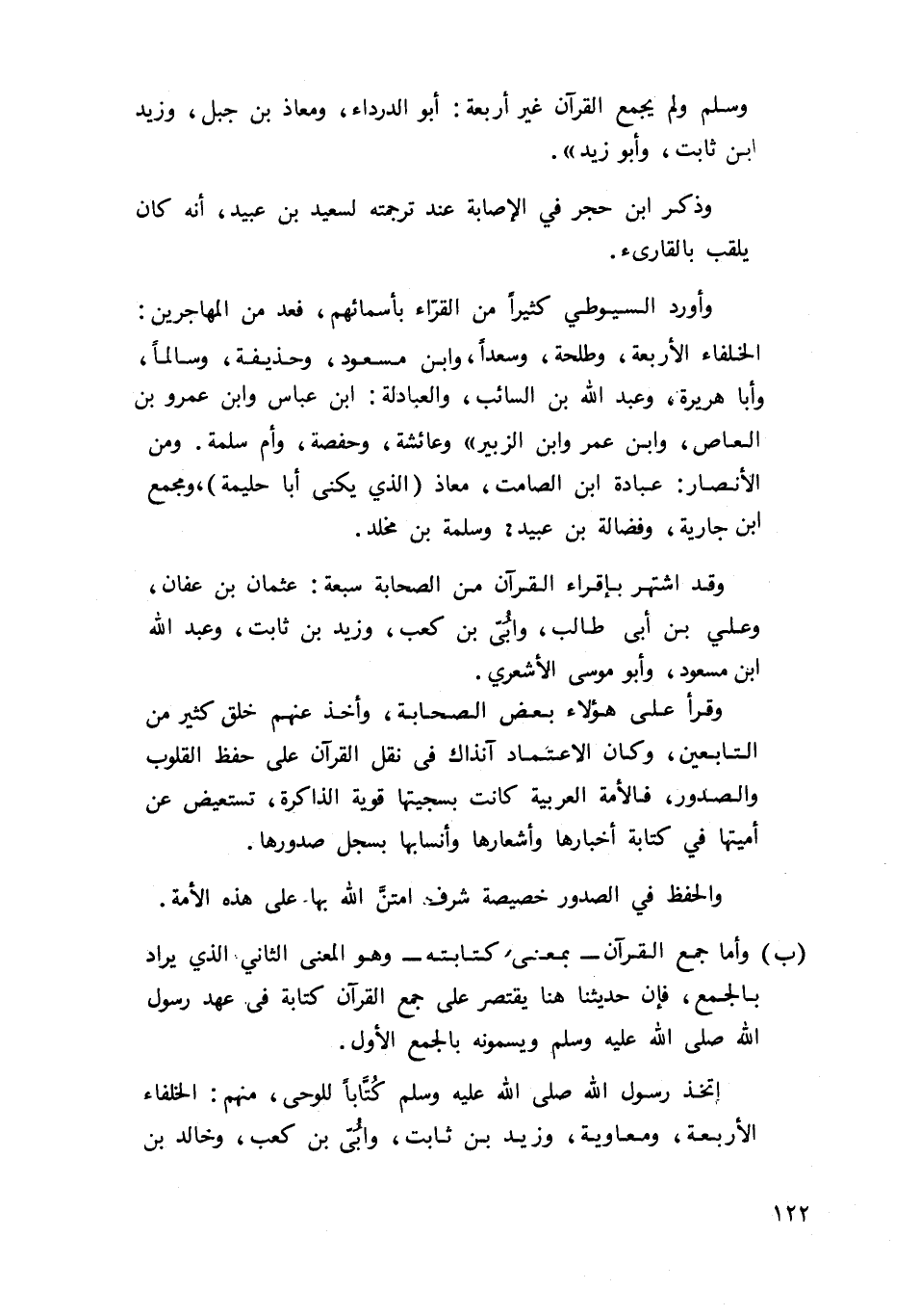 وسلم ولم يجمع القرآن غير أربعة: أبو الدرداء، ومعاذ بن جبل، وزيد ابن ثابتن وأبو زيد".