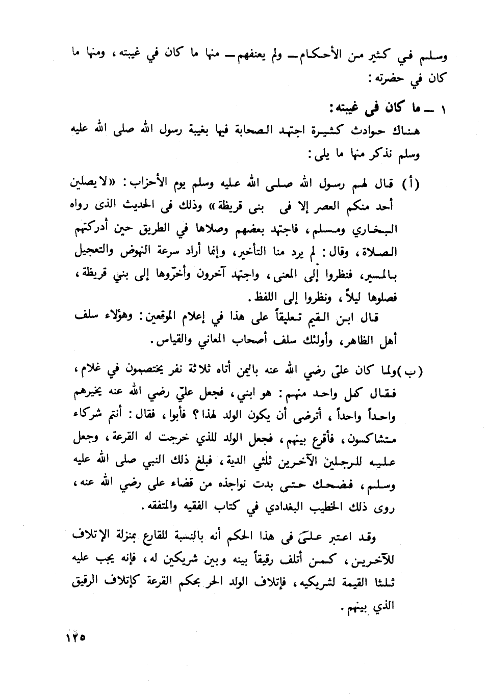 أ- قال لهم رسول الله صلى الله عليه وسلم يوم الأحزاب: "لا يصلين أحد منكم العصر إلا في بني قريظة" وذلك في الحديث الذي رواه البخاري ومسلم، فاجتهد بعضهم وصلاها في الطريق حين أدركتهم الصلاة، وقال: لم يرد منا التأخير، وإنما أراد سرعة النهوض والتعجيل بالمسير، فنظروا إلى المعنى، واجتهد آخرون وأخروها إلى بني قريظةن فصلوها ليلا، ونظروا إلى اللفظ.