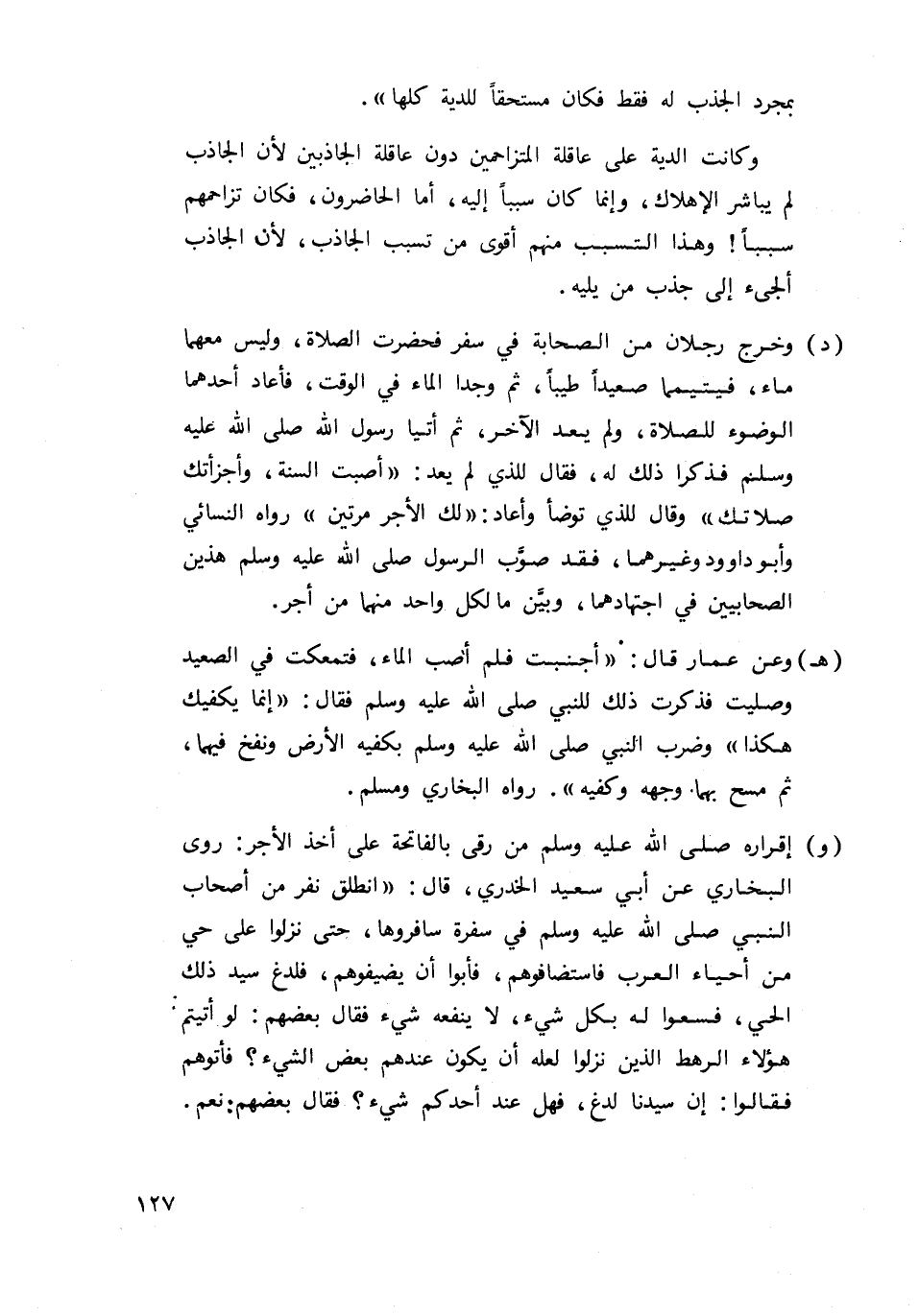 د- وخرج رجلان من الصحابة في سفر فحضرت، وليس معهما ماء، فيتيمما صعيدا طيبا، ثم وجدا الماء في الوقت، فأعاد أحدهما الوضوء للصلاة، ولم يعد الآخر، ثم أتيا رسول الله صلى الله عليه وسلم فذكر ذلك له، فقال للذي لم يعد: "أصبت السنة، وأجزأتك صلاتك" وقال للذي توضأ وأعاد "لك الأجر مرتين" رواه النسائي وأبو داود وغيرهما، فقد صوب الرسول الله صلى الله عليه وسلم هذين الصحابين في اجتهادهما، وبين ما لك واحد منهما من أجر.