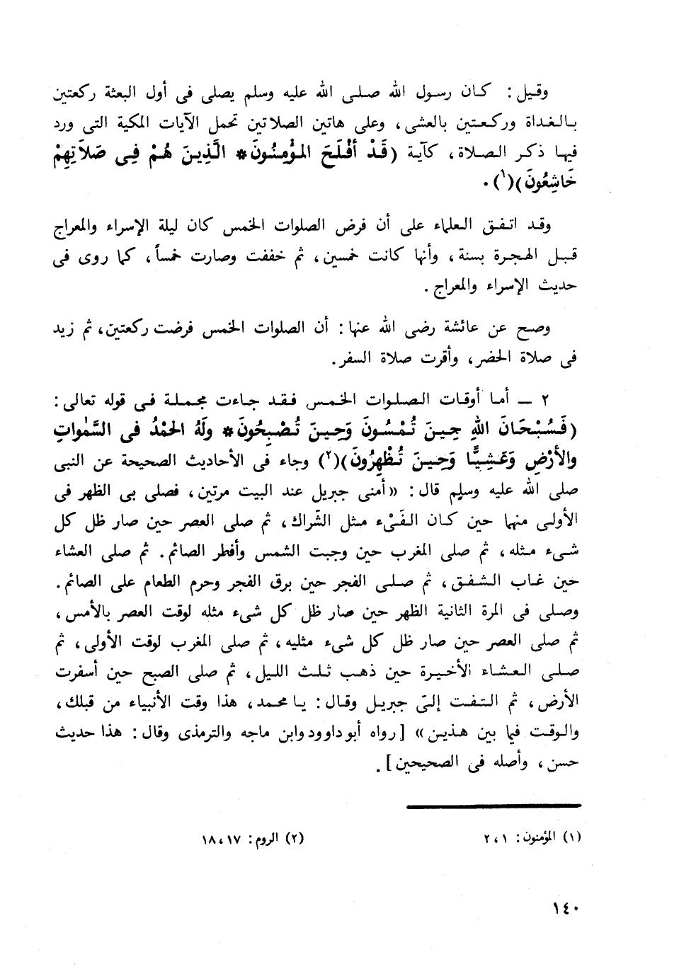 وقيل: كان رسول الله صلى الله عليه وسلم يصلي في أول البعثة ركعتين بالغداة وركعتين بالعشي، وعلى هاتين الصلاتين تحمل الآيات المكية التي ورد فيها ذكر الصلاة، كآية {قَدْ أَفْلَحَ الْمُؤْمِنُونَ، الَّذِينَ هُمْ فِي صَلاتِهِمْ خَاشِعُون} 1.