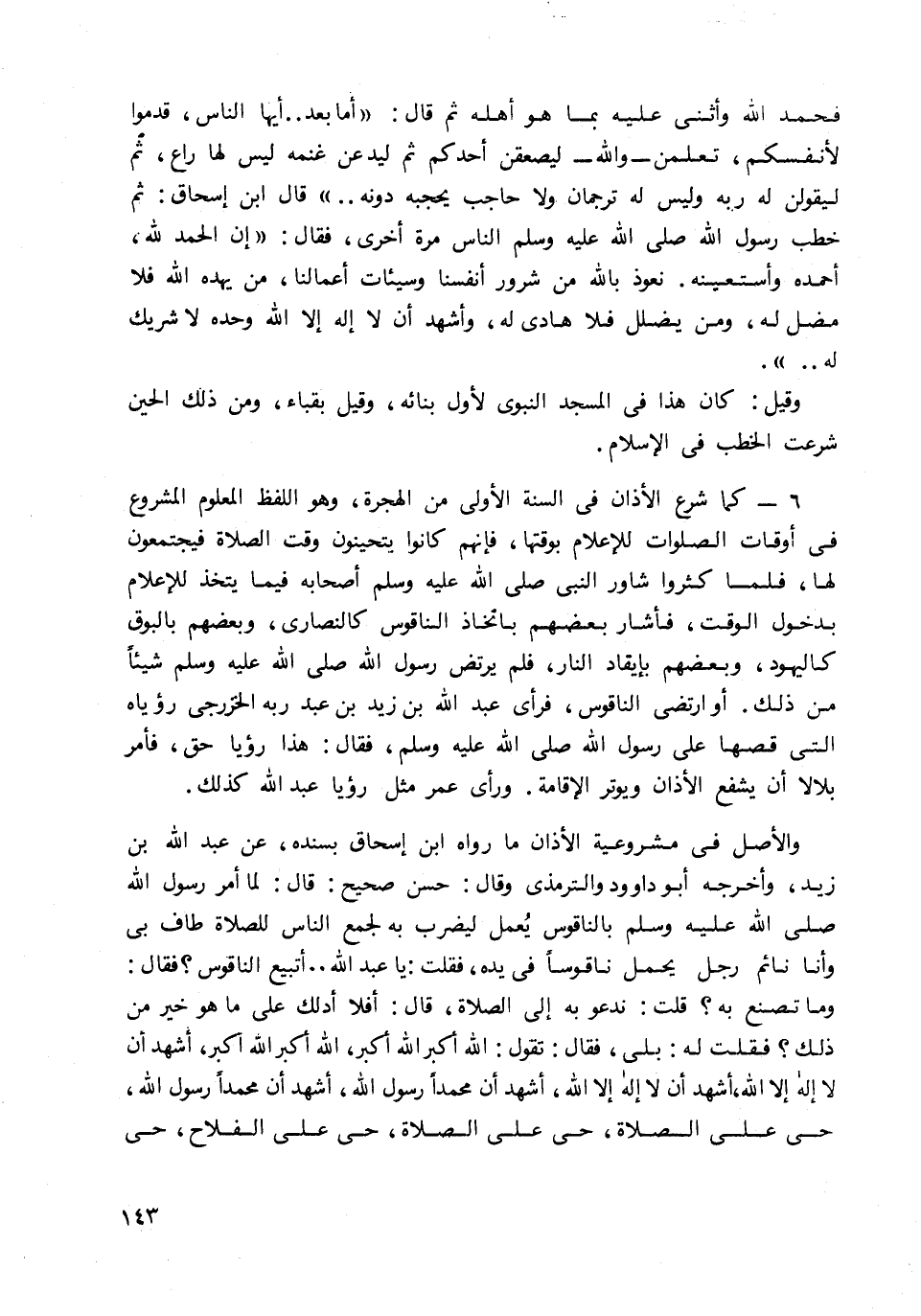 6- كما شرع الأذان في السنة الأولى من الهجرة، وهو اللفظ المعلوم المشروع في أوقات الصلوات للإعلام بوقتها، فإنهم كانوا يتحينون وقت الصلاة فيجتمعون لها، فلما كثروا شاورا النبي صلى الله عليه وسلم أصحابه فيما يتخذ للإعلام بدخول الوقت، فأشار بعضهم باتخاذ الناقوس كالنصارى، وبعضهم بالبوق كاليهود، وبعضهم بإيقاد النار، فرأى عبد الله بن زيد بن عبد ربه الخزرجي رؤياه التي قصها على رسول الله صلى الله عليه وسلم، فقال: هذا رؤيا حق، فأمر بلالا أن يشفع الأذان ويوتر الإقامة. ورأي عمر مثل رؤيا عبد الله كذلك.