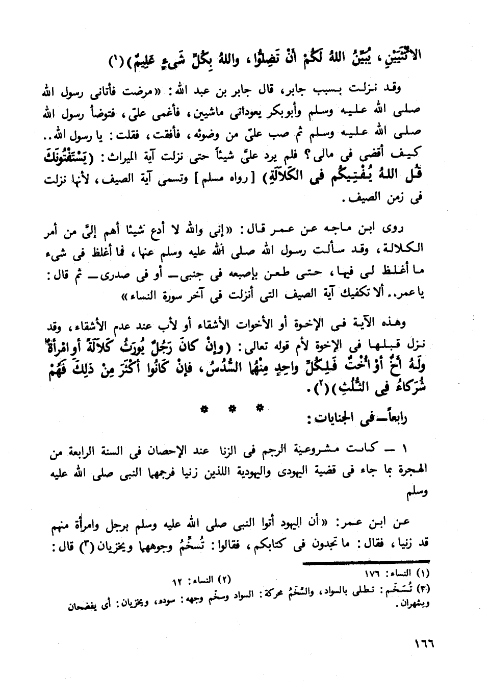 روى ابن ماجه عن عمر قال: "إني والله لا أدع شيئا أهم إلى من أمر الكلالة، وقد سألت رسول الله صلى الله عليه وسلم عنها، فما أغلظ في شيء ما أغلظ لي فيها، حتى طعن بإصبعه في جنبي أو في صدري - ثم قال: يا عمر ... ألا تكفيك آية الصيف التي أنزلت في آخر سورة النساء"