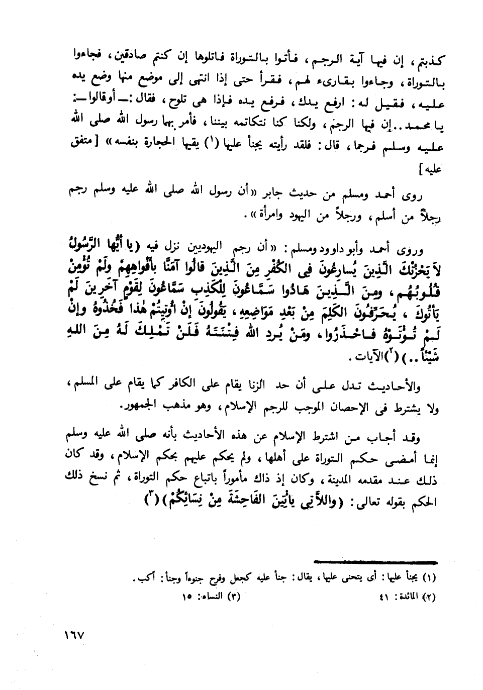 وقد أجاب من اشترط الإسلام عن هذه الأحاديث بأنه صلى الله عليه وسلم إنما أمضي حكم التوراة على أهلها، ولم يحكم عليهم بحكم الإسلام، وقد كان ذلك عند مقدمة المدينة، وكان إذ ذاك مأمورا باتباع حكم التوراة، ثم نسخ ذلك الحكم بقوله تعالى: {وَاللَّاتِي يَأْتِينَ الْفَاحِشَةَ مِنْ نِسَائِكُمْ} 3.