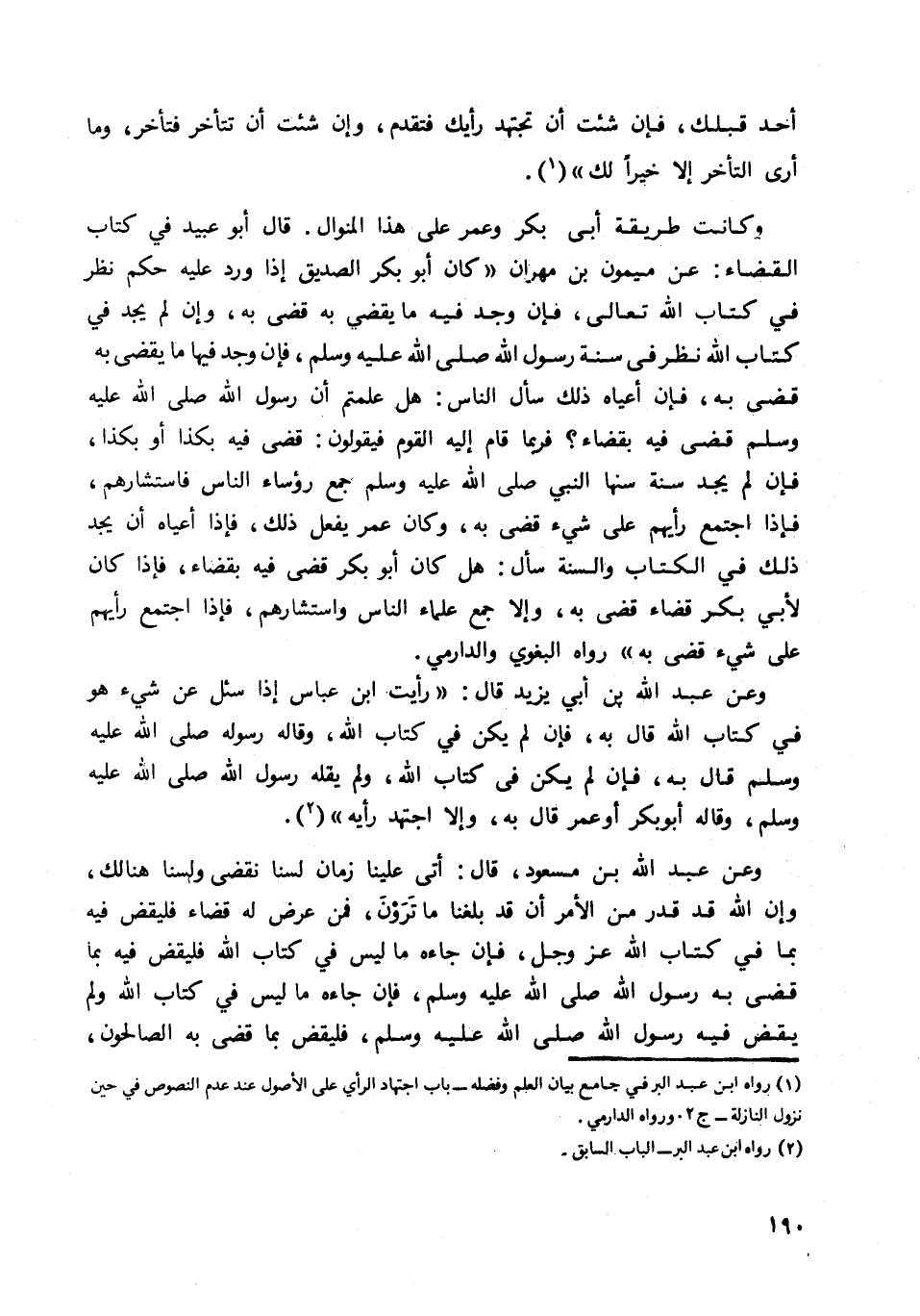 1 رواه ابن عبد البر في الجامع بيان العلم وفضله باب اجتهاد الرأي على الأصول عند عدم النصوص في حين نزول النازلة - جـ2. ورواه الدارمي.