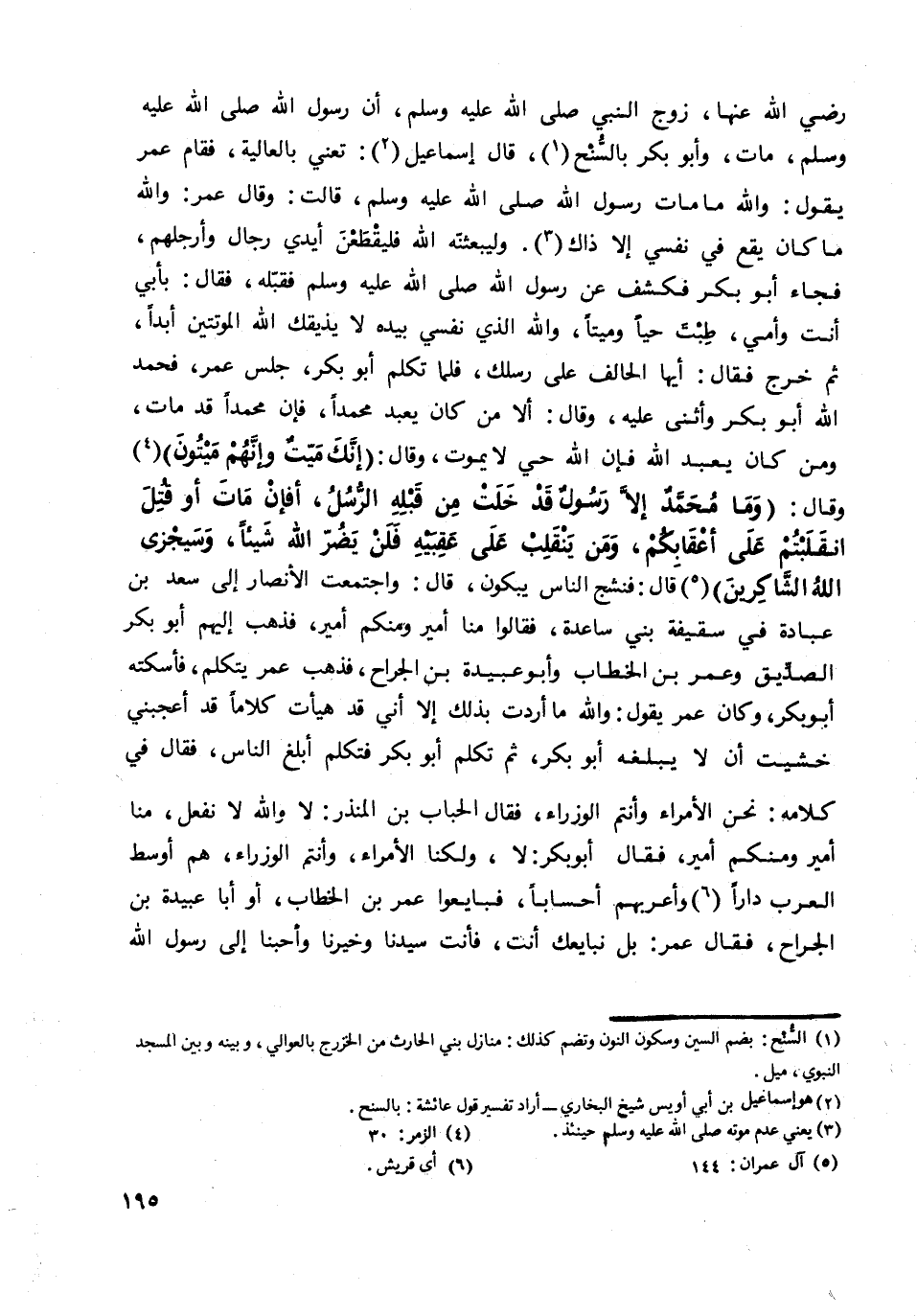 رضي الله عنها، زوج النبي صلى الله عليه وسلم، أن رسول الله صلى الله وسلم، مات، وأبو بكر بالسنح1 قال إسماعيل2ك تعنى بالعالية، فقام عمر يقول: والله ما مات رسول الله صلى الله عليه وسلم، قالت: وقال عمر: والله ما كان يقع في نفسي إلا ذاك 3. وليبعثنه الله فليقطعن أيدي رجال وأرجلهم، فجاء أبو بكر فكشف عن رسول الله صلى الله عليه وسلم فقبله، فقال: بأبي أنت وأمي، طبت حيا وميتا، والله الذي نفسي بيده لا يذيقك الله الموتتين أبدا، ثم خرج فقال: أيها الحالف على رسلك، فلما تكلم أبو بكر، جلس عمر، فحمد الله أبو بكر وأثنى عليه، وقال: ألا من كان يعبد محمدا، فإن محمدا قد مات. ومن كان يعبد الله فإن الله حي لا يموت، وقال: {إِنَّكَ مَيِّتٌ وَإِنَّهُمْ مَيِّتُونَ} 4 وقال: {وَمَا مُحَمَّدٌ إِلَّا رَسُولٌ قَدْ خَلَتْ مِنْ قَبْلِهِ الرُّسُلُ أَفَإِنْ مَاتَ أَوْ قُتِلَ انْقَلَبْتُمْ عَلَى أَعْقَابِكُمْ وَمَنْ يَنْقَلِبْ عَلَى عَقِبَيْهِ فَلَنْ يَضُرَّ اللَّهَ شَيْئًا وَسَيَجْزِي اللَّهُ الشَّاكِرِينَ} 5 قال: فنشج الناس يبكون، قال: واجتمعت الأنصار إلى سعد بن عبادة في سقيفة بني ساعدة، فقالوا منا أمير ومنكم أمير، فذهب عمر يتكلم فأسكته أبو بكر، وكان عمر يقول: والله ما أردت بذلك إلا أنى قد هيأت كلاما قد أعجبني خشيت أن لا يبلغه أبو بكر، ثم تكلم أبو بكر فتكلم أبلغ الناس، فقال في كلامه: نحن الأمراء وأنتم الوزراء فقال الحباب بن المنذر: لا والله لا نفعل، منا أمير ومنكم أمير، فقال أبو بكر: لا ولكنا الأمراء، وأنتم الوزراء، هم أوسط العرب دارا6 وأعربهم أحسابا، فبايعوا عمر بن الخطاب، أو أبا عبيدة بن الجراح، فقال عمر: بل نبايعك أنت، فأنت سيدنا وخيرنا وأحبنا إلى رسول الله