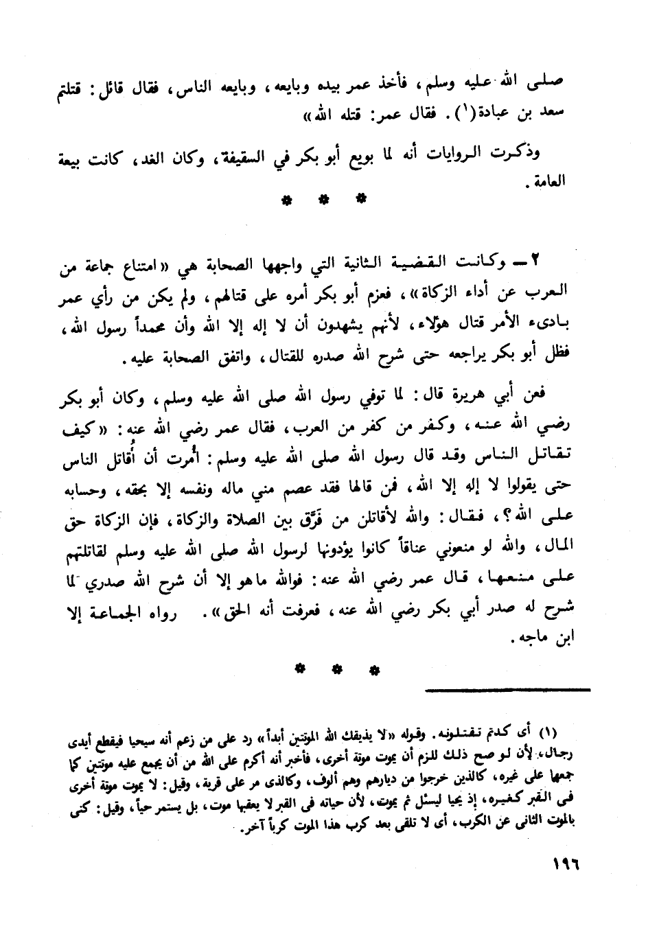 2- وكانت القضية الثانية التي واجهها الصحابة هي "امتناع جماعة من العرب عن أداء الزكاة" فعزم أبو بكر أمره على قتالهم، ولم يكن من رأي عمر باديء الأمر قتال هؤلاء، لأنهم يشهدون أن لا إله إلا الله وأن محمدا رسول الله، فظل أبو بكر يراجعه حتى شرح الله صدره للقتال، واتفق الصحابة عليه.