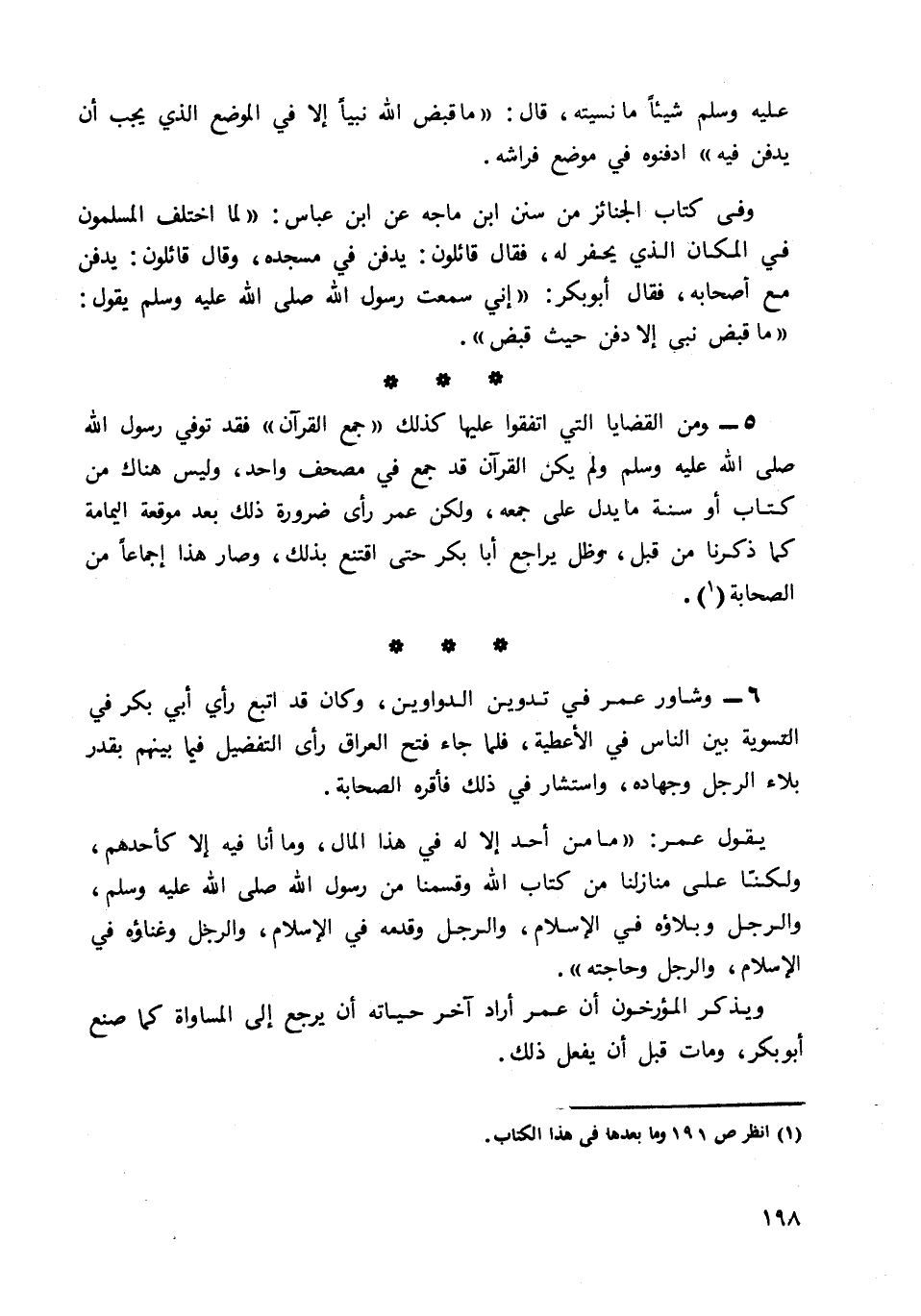 5- ومن القضايا التي اتفقوا عليها كذلك "جمع القرآن" فقد توفى رسول الله صلى الله عليه وسلم ولم يكن القرآن قد جمع في مصحف واحد، وليس هناك من كتاب أو سنة ما يدل على جمعه، ولكن عمر رأي ضرورة ذلك بعد موقعة اليمامة كما ذكرنا من قبل، وظل يراجع أبا بكر حتى اقتنع بذلك، وصار هذا إجماعا من الصحابة1.
