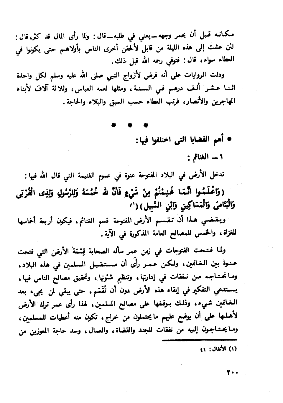 ولما فتحت الفتوحات في زمن عمر سأله الصحابة قسمة الأرص التي فتحت عنوة بين الغانمين، ولكن عمر رأي مستقبل المسلمين في هذه البلاد، وما تحتاجه من نفقات في إدارتها، وتنظيم شئونها، وتحقيق مصالح الناس فيها، يستدعى التفكير في إبقاء هذه الأرض دون أن تقسم، حتى يبقى لمن يجيء بعد الغانمين شيء، وذلك بوقفها على مصالح المسلمين، لهذا رأي عمر ترك الأرض لأهلها على أن يوضع عليهم ما يحتملون من خراج، تكون منه أعطيات للمسلمين، وما يحتاجون إليه من نفقات للجند والقضاة، والعمال، وسد حاجة المعوزين من