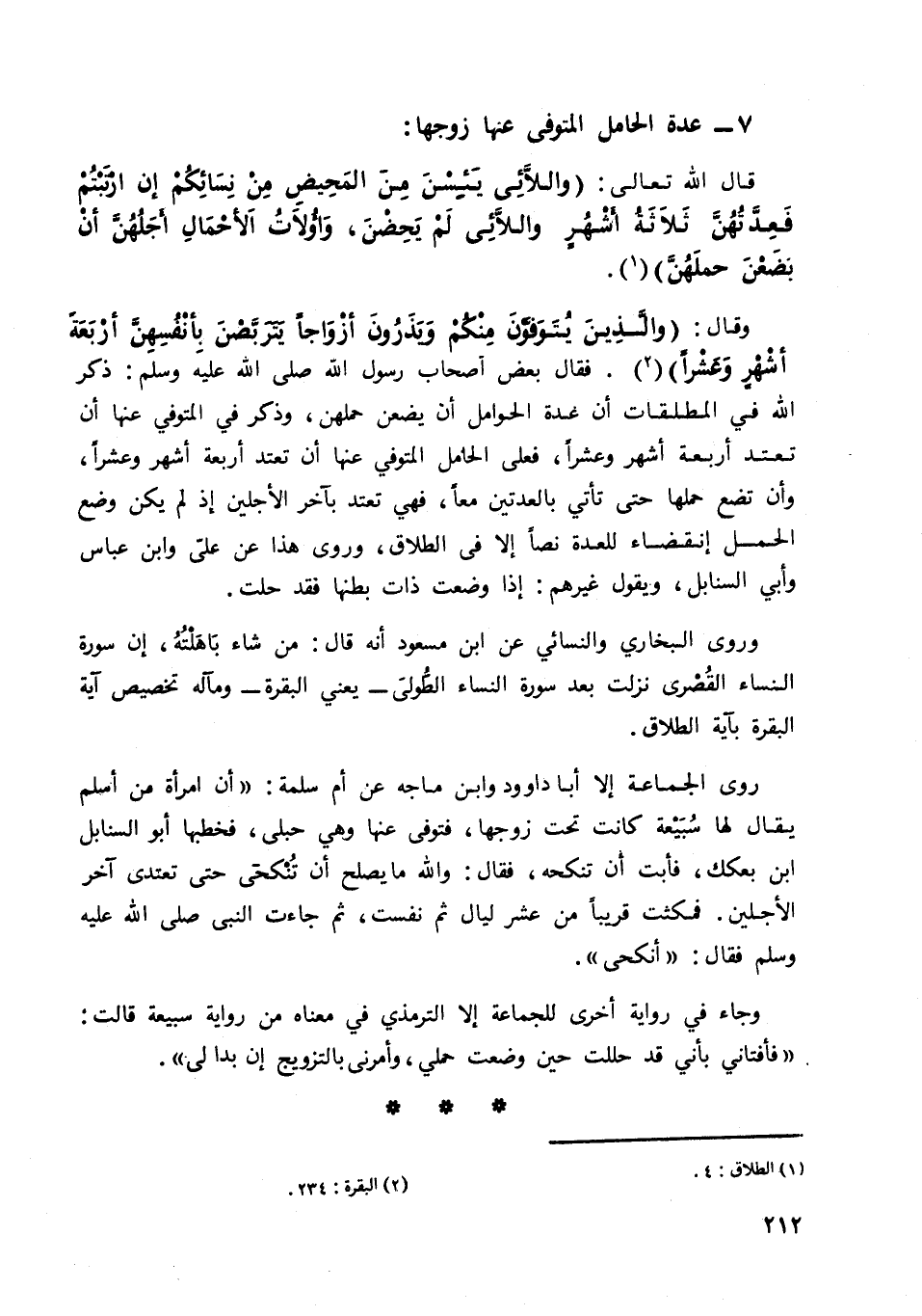روى الجماعة إلا أبا داود وابن ماجه عن أم سلمة: "أن امرأة من أسلم يقال لها سبيعة كانت تحت زوجها، فتوفي عنها وهي حبلى، فخطبها أبو السنابل ابن بعكك، فأبت أن تنكحه، فقال: والله ما يصلح أن تنكحي حتى تعتدي آخر الأجلين. فمكثت قريبا من عشر ليال ثم نفست، ثم جاءت النبي صلى الله عليه وسلم فقال: "أنكحي".